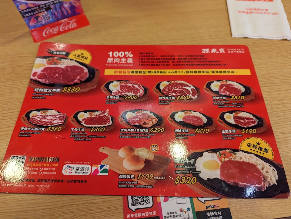 餐點部分,點了一個主廚牛兩個超大牛皆為7分熟及一個主廚雞跟主廚豬,主廚牛熟度不到7分,大概只有五分熟,兩個超大牛三分之一是七分熟,剩下三分之二已經九分熟了,豬排乾,雞排更是又乾又硬,連我五歲的小女兒都嫌棄,送餐時,服務生鐵盤還滑出,差點直接燙到小孩,玉米濃湯料多還不錯喝,飲料有紅茶跟無糖綠茶,我喝了一口紅茶就改喝無糖綠,因為紅茶味道像餐廳用濕紙巾的味道,太可怕了,另外點了薯條跟雞塊,就這兩樣最正常,真的建議吃孫東寶不如去吃夜市牛排,還比較好吃也比較便宜,還會親切問你要點什麼餐