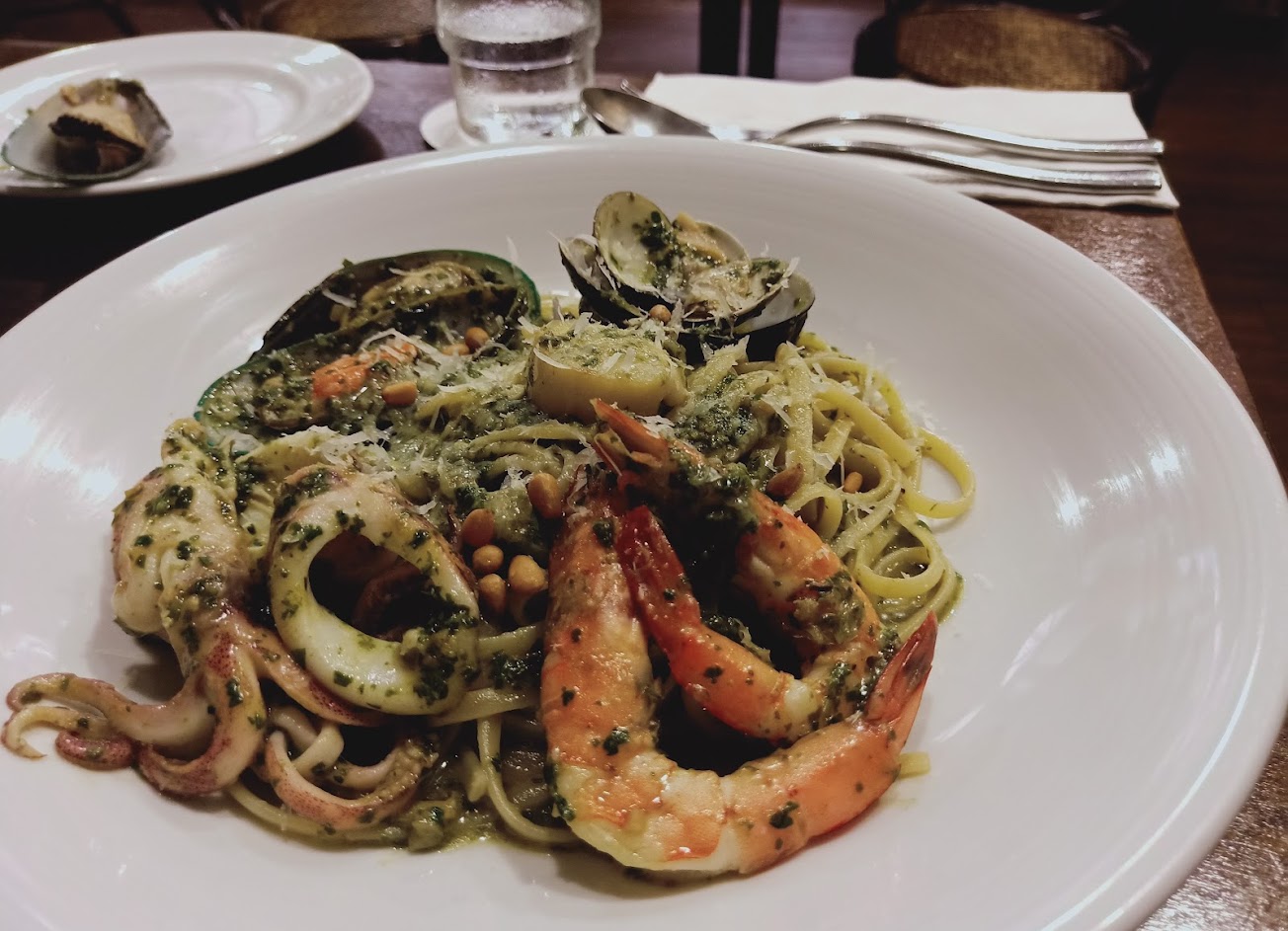 舒適的用餐環境很寬敞,服務很好,我們點的是青醬海鮮義大利麵和鴨胸義大利麵,海鮮很新鮮澎湃,鴨胸的口味比較特別,鷹嘴豆湯和佛卡夏麵包好吃,甜點也不錯