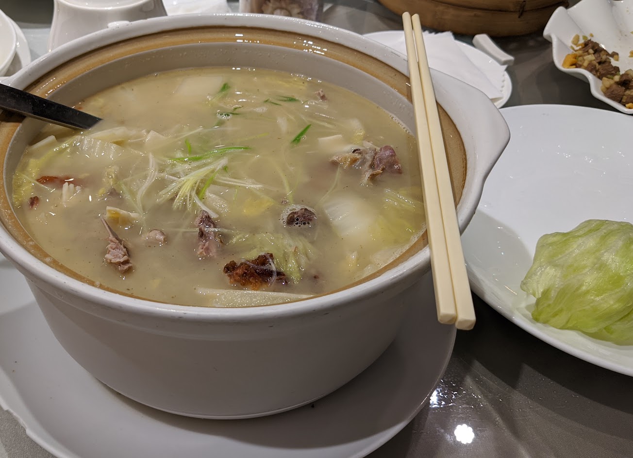 我們一家4口點的一鴨三吃,鴨餅吃完鴨鬆和鴨湯都有餘打包,可見份量很足。鴨餅主要包鴨皮,覺得皮不夠脆可再烤焦點,但包上糖汁檸檬片非常對味,鴨鬆清爽可口,鴨湯加了酸白菜、筍子、米粉是我最喜愛的,非常推薦一試。