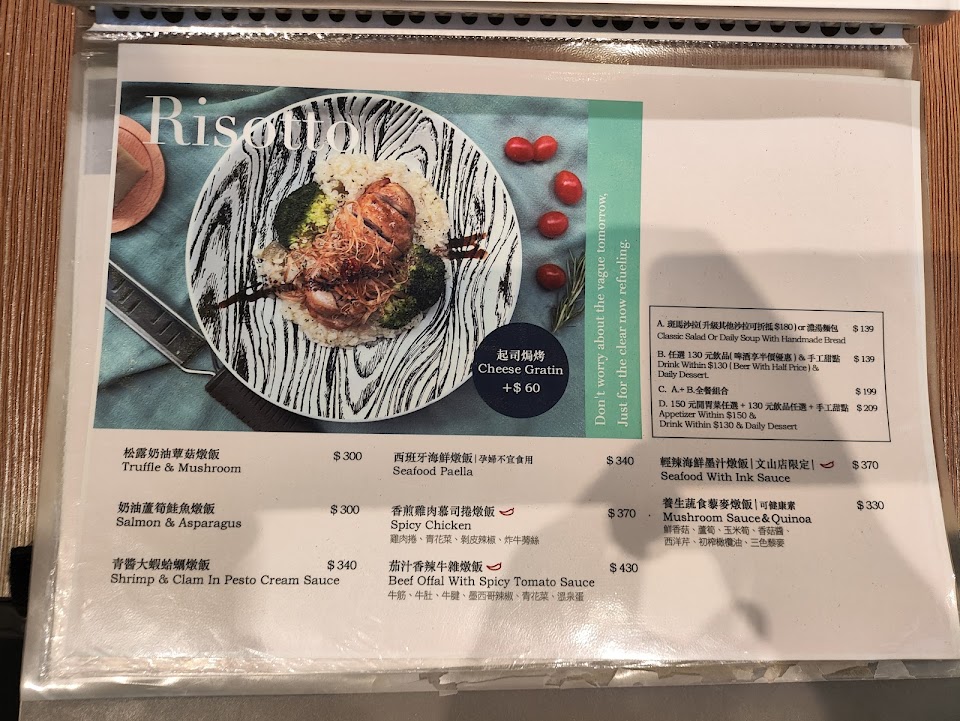 服務很周到,店員態度很客氣。義大利麵和燉飯都好吃,海鮮披薩口味較清淡,加葡萄醋能提味。可以加會員能有一杯會員禮飲料,酸酸甜甜的還ok。限時90分鐘。會回訪。
