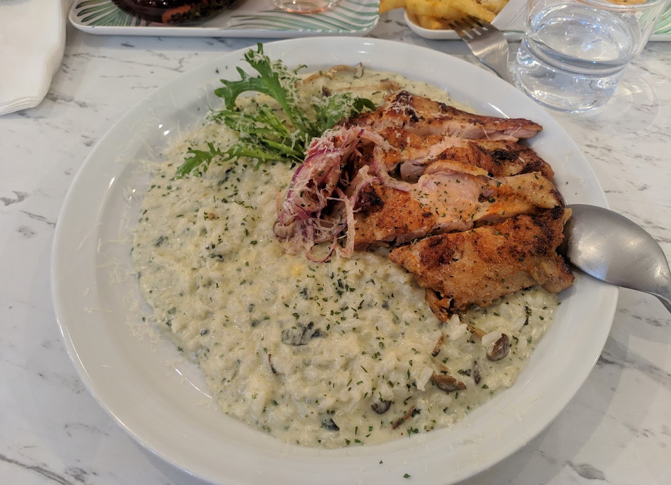 燉飯口味不錯,保有一點點米心,但是鴨胸不好嚼,待改善。雞腿沙拉的蔬菜實在不怎麼樣,種類應該要更多。豬腳還不錯,搭配的烤蔬菜也蠻好的。環境不錯,服務態度也好。