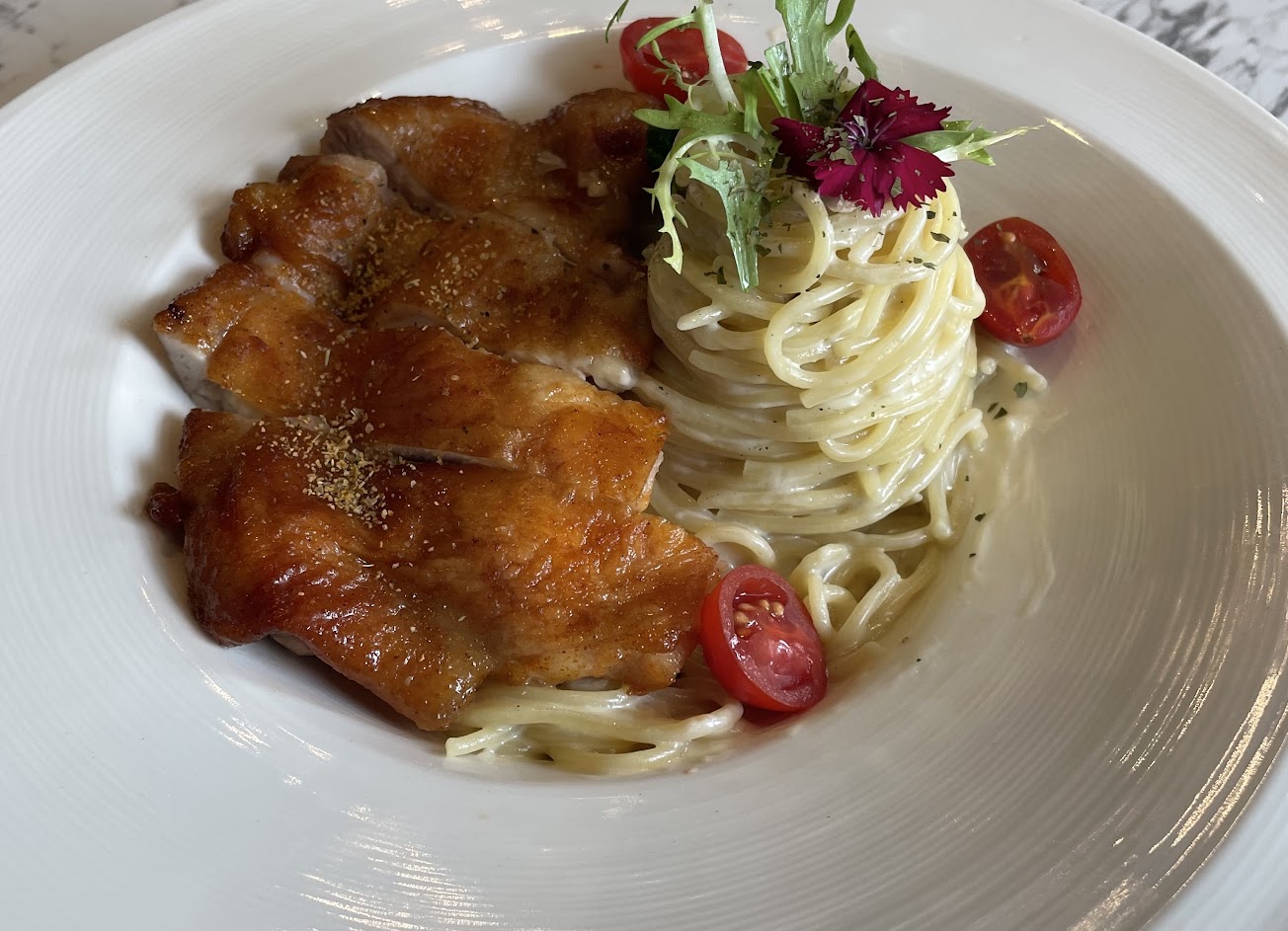數一數二我喜歡的羅勒義大利麵!醬香濃郁和麵條搭配出極致美味!番茄湯也是很清甜。大推梅子雞,肉質好鮮嫩!重點是服務人員很棒,對於首次用餐的人解釋很詳細^_^