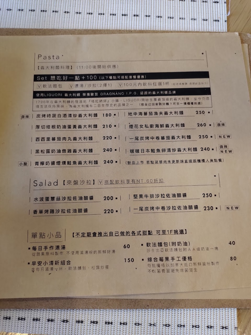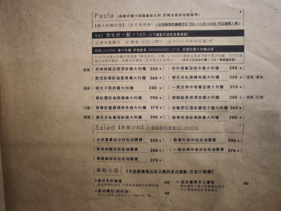 當天坐一樓的2人桌但跟隔壁桌緊鄰,只有用一個壓克力隔板,吃起來頗有壓力…這一點稍微扣分,店裡還有販賣松露蘑菇醬跟義大利麵條,在等餐的時候可以看看