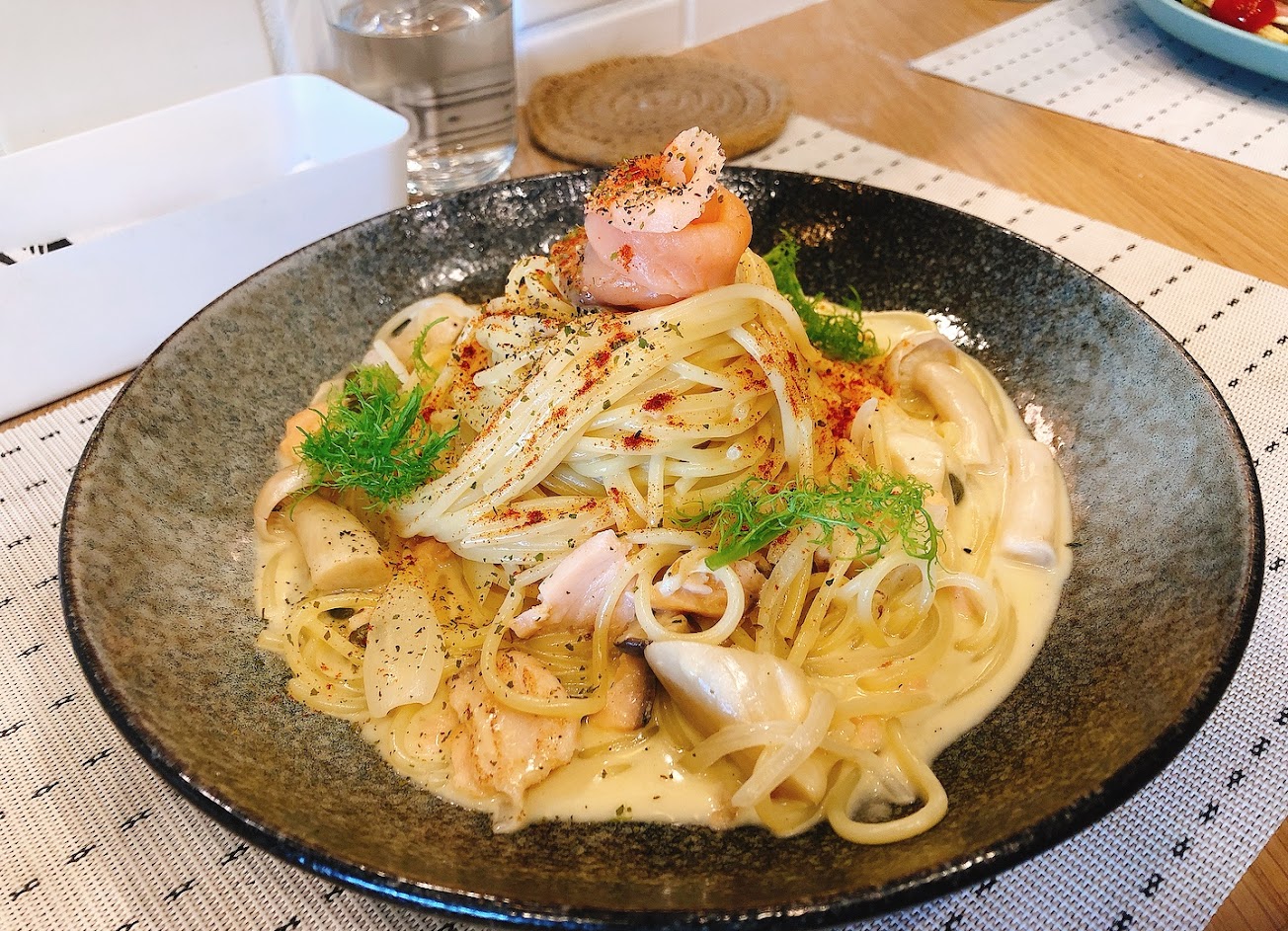 清炒義大利麵很好吃,幾乎快吃完~裡面有鮭魚以及鮭魚卵、茄子、杏鮑菇、生菜,鮭魚如果能改成鮭魚肚或者煙燻鮭魚片就更好了,茄子的出現蠻有創意的,也蠻令人感到意外,我覺得是好吃的,不喜歡茄子的朋友要多注意~