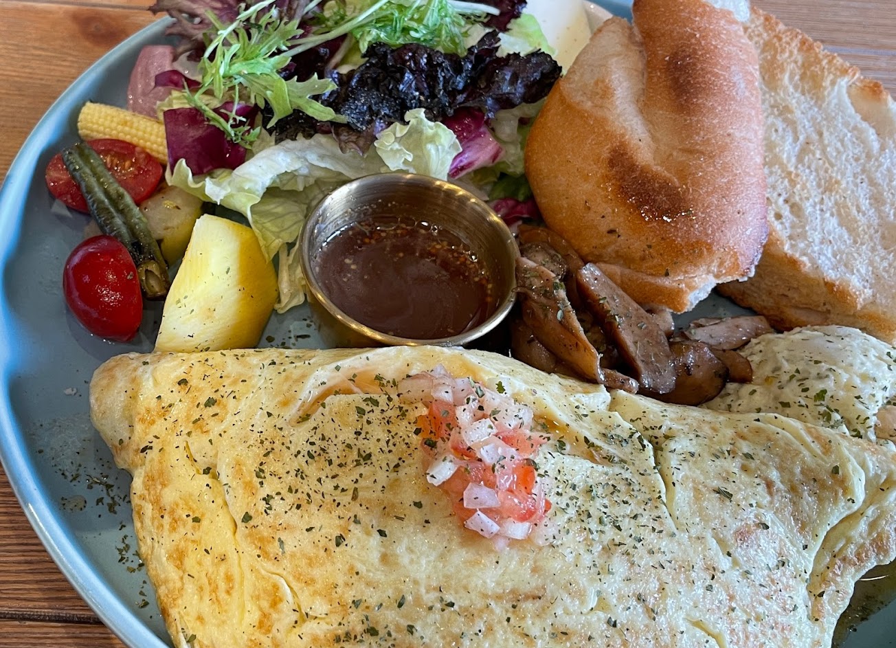 好吃用心,油醋醬同伴說好吃!馬鈴薯球伴了檸檬奶油,酸香美味,炒蕈菇乾Q入味!麵包很有嚼勁,歐姆蛋油滑香嫩,配上辣雞提味謝恩好吃!是個各種配菜都很用心的好店!