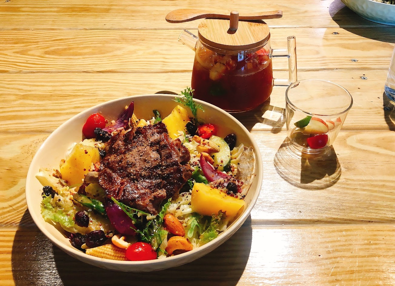 當天用餐時因為沒有很餓,所以點了一份堅果牛排沙拉佐油醋醬,搭配的水果、生菜、蔓越莓乾等都很好吃,牛排也是很嫩,好吃到直接清盤?另外加點的水果茶沒有很甜也很喜歡~