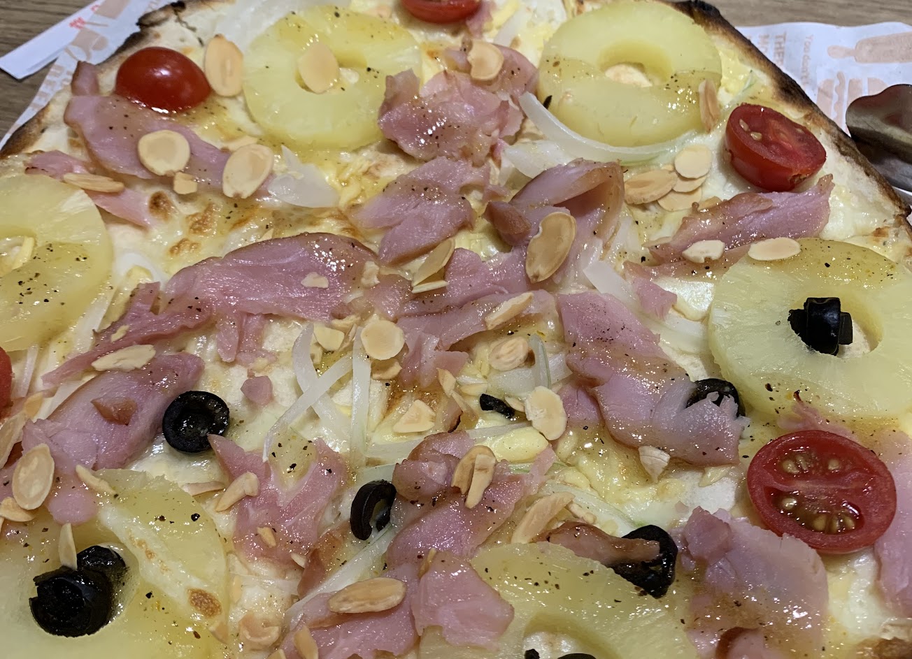 不同的pizza上有不同的水果,有柳橙片,有鳳梨,很合小孩的胃口,很常從uber eats點餐,一定會點的檸檬慕思沙拉,非常爽口,炸物也都不錯。非傳統道地的pizza,但是我們非常喜歡。