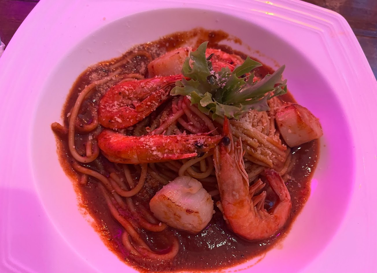 晚餐時間去用餐:我覺得海鮮清炒義大利麵很爽口,份量適中,海鮮稍嫌不夠入味,奶油濃湯不夠熱,味道還算一般,沙拉的口味很清爽很不錯吃。