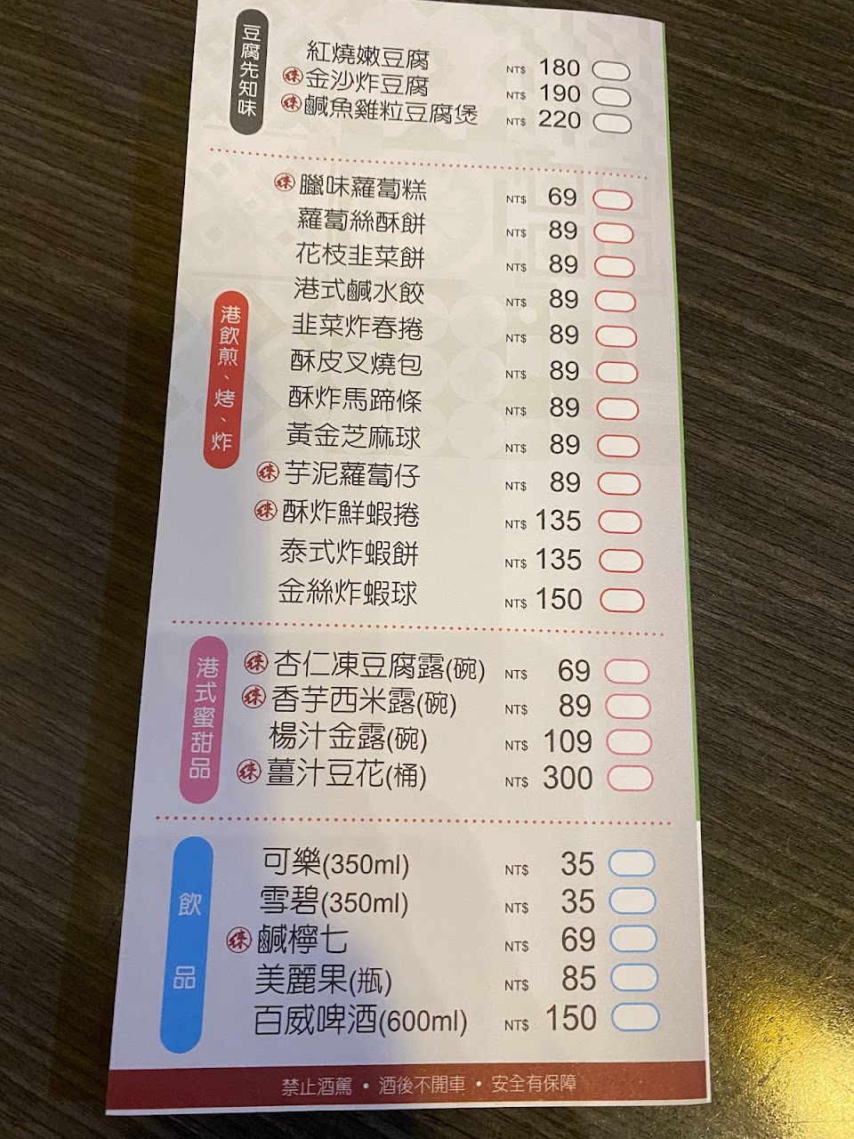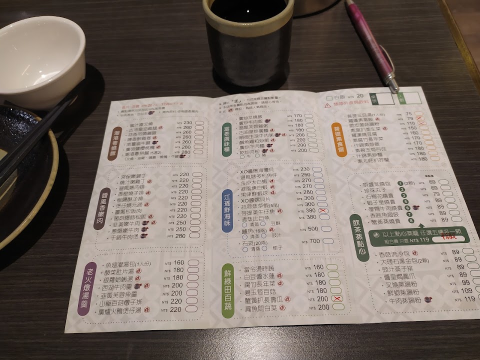 依進來內用的人數預設茶資$20/人、餐點價格均另外加收10%服務費,禁帶外食/飲料,合菜單點制,白飯$20/碗,本次點羅漢燒豆腐$160、蔥爆炒牛肉$250、素腐竹長年菜$170、避風塘多利魚件$250、廣爐火鴨煲仔湯$220;之前點豆腐用的是雞蛋豆腐比較好吃,這次點餐變成使用一般白豆腐(素),眾人均表示明顯變得沒那麼好吃了,菜內的腐竹偏硬,牛肉一樣好吃,多利魚用炸的撒辛香料,不過不是用沾醬的,雖魚體好吃但較無味,湯內有皮蛋,味道複雜但尚可;前幾次來有另外點尚在開放的素食甜點,但口味上不佳;可刷卡、有提供電子發票可存載具。