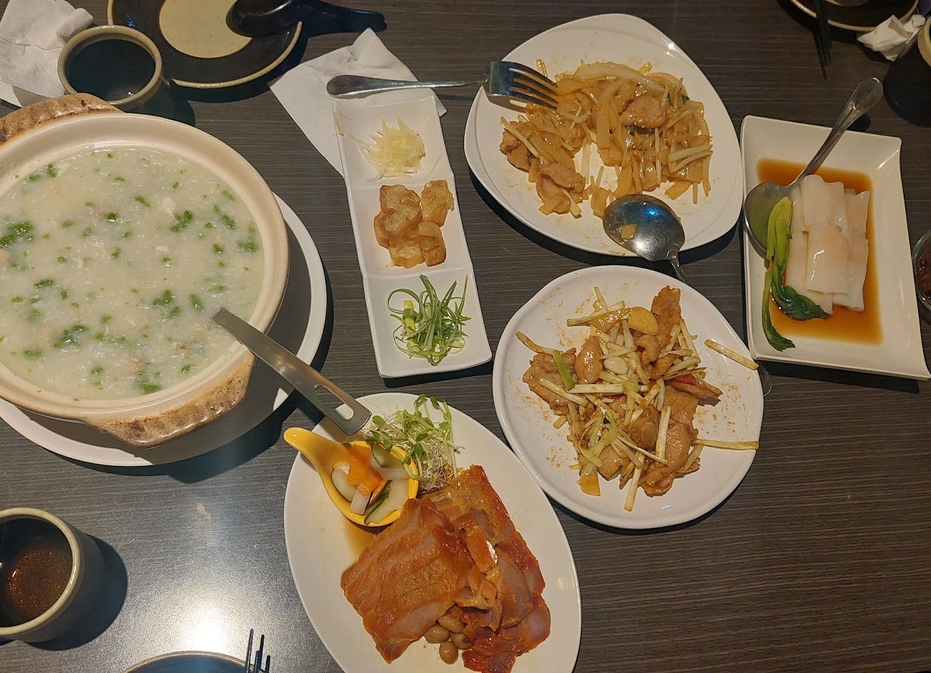 楊枝甘露, 叉燒蒸腸粉, 白豆醬炒水蓮, 潮港拼盤 蜜汁叉燒 明爐烤鴨, 揚州炒飯