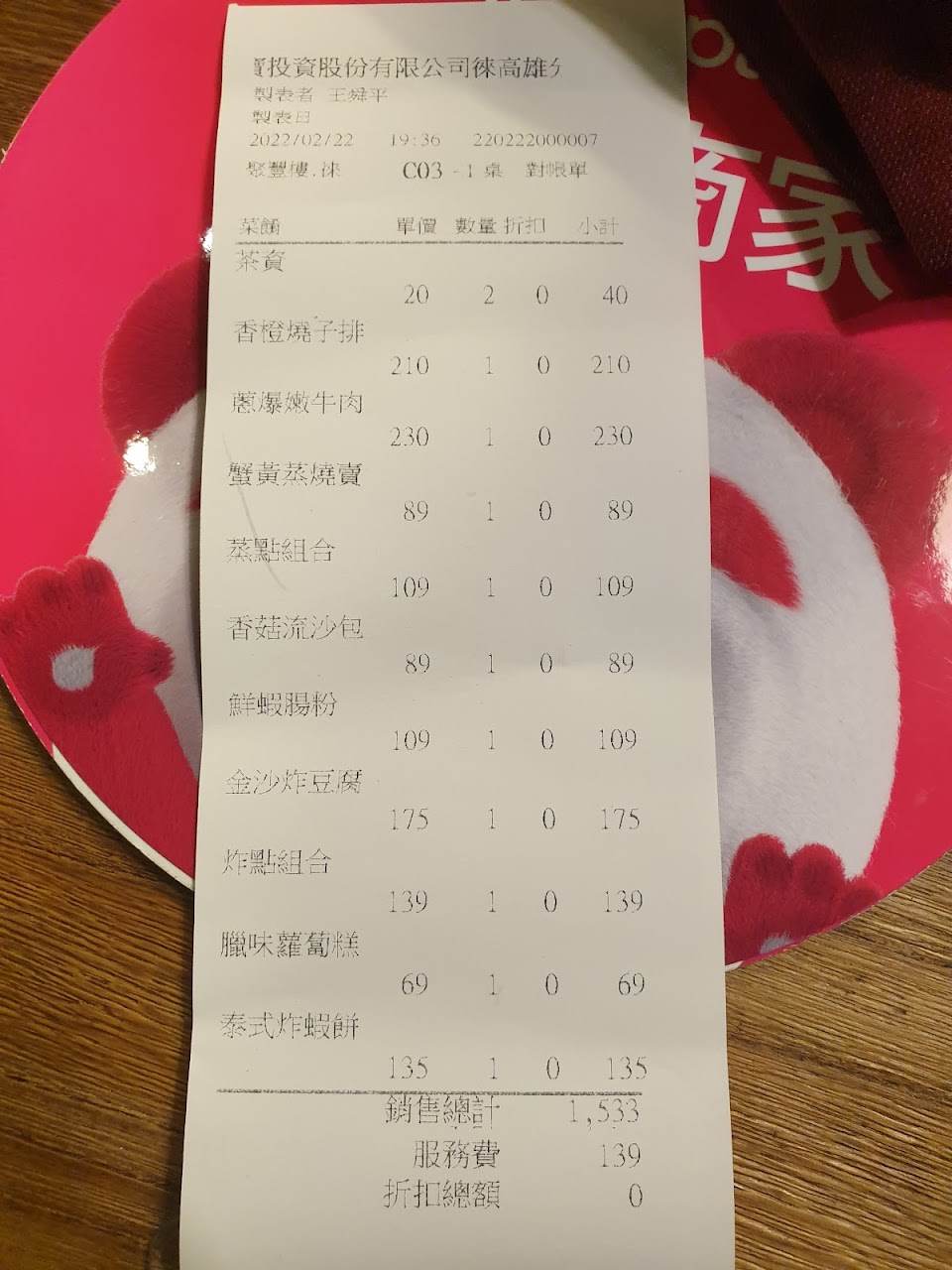 服務費用:有,餐點均另計10%服務費。