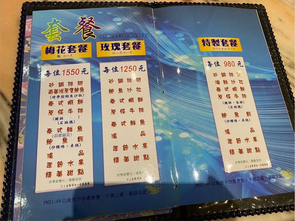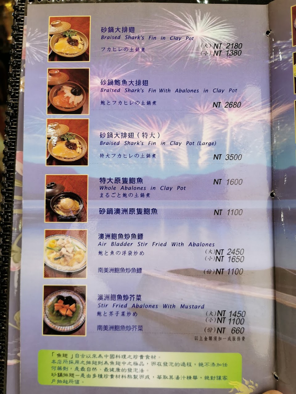 東西很好吃,是高檔的餐廳,師傳是泰國人,不过也有套餐一千多元也是有魚翅,人參雞湯,牛排,蒸魚,鮑魚飯,甜點是木耳蓮子,餐前就泡人參茶,喝完叫服務人員加,不过大部份是服務人員会看,反正共十種,才一千4百元加一成服務費,1600有找,很滑的來
