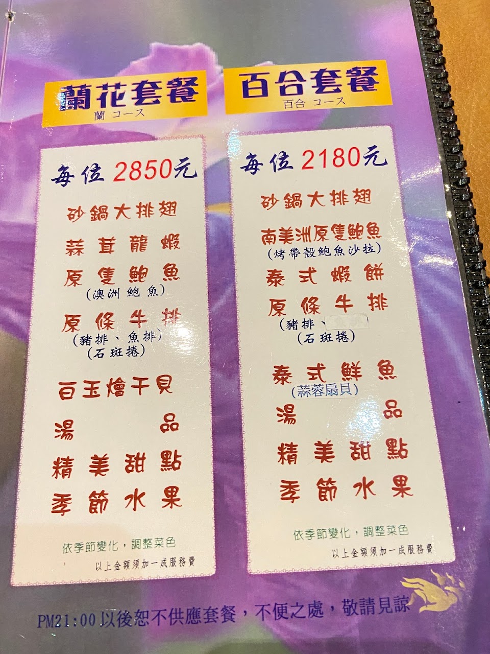 魚翅、西瓜汁、海鮮沙拉、泰式蝦餃、牛排(三選)、鮑魚飯、人參蕃薯湯(三選)、時令水果