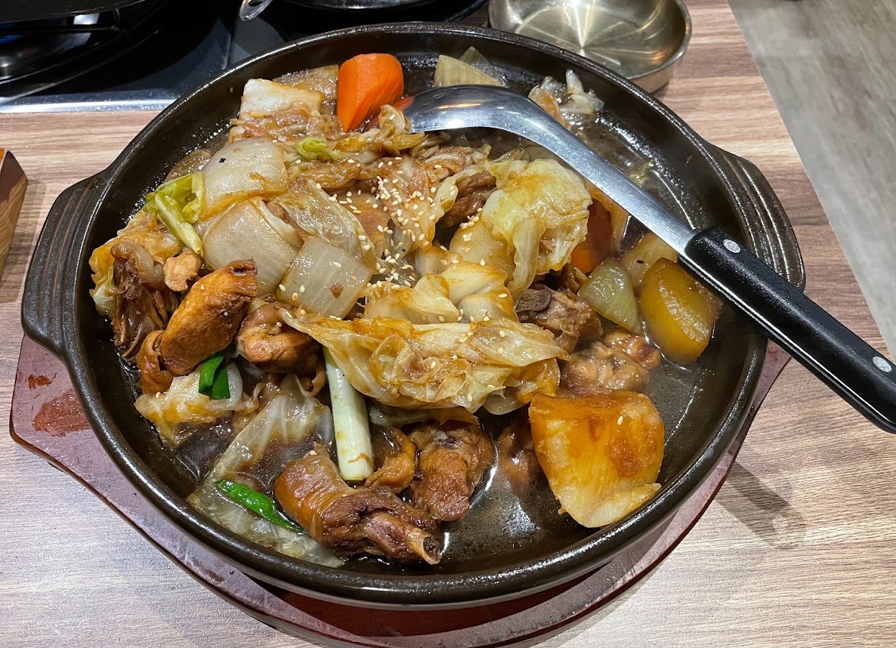 套餐+安東雞 服務人員有提醒2人應該是太多,桌邊服務很精彩 ,2人份的套餐確實足夠,不像其他的餐飲業者標榜不足。 烤盤上的泡菜跟小盤子的泡菜是不一樣的(跟服務員問過),小盤子的泡菜有點甜,我想烤盤上的比較接近韓式泡菜,安東雞太甜,太座說韓國的安東雞辣的要死,但是很好吃,其他小菜都很好吃。工作人員每個都很忙,沒有一個是停在那裡的,很棒的工作團隊服務也是一樣。建議安東雞跟泡菜甜度調整一下。