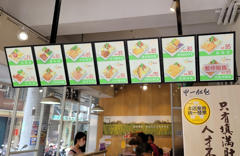 價格區間為75~110元,主餐有雞、豬、牛、魚,選擇滿多;便當有3種配菜+1~2種小配菜(菜脯、香腸片…),可以自己包湯,主餐單點約40元,便當飯量大,胃口小的可以兩人吃一個。