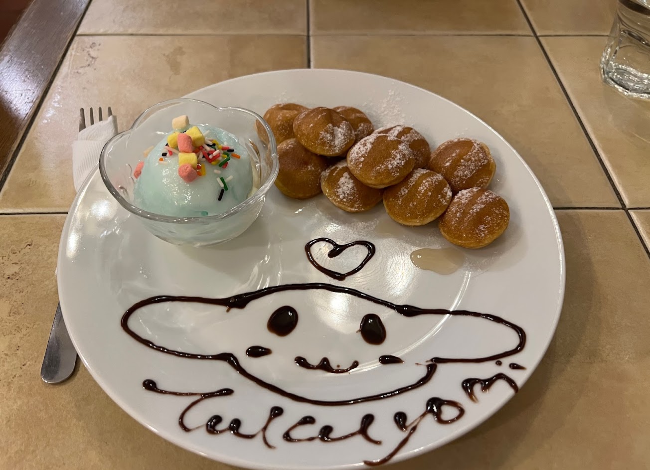 咖啡廳採購的球狀鬆餅口感不佳,奶油在烤時塗太多,冰淇淋(個人飲食習慣不愛太甜的食品)還有繪盤的畫 很悲劇(