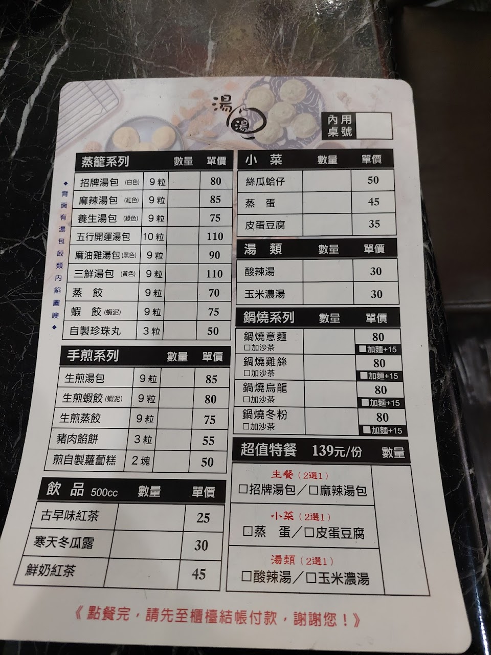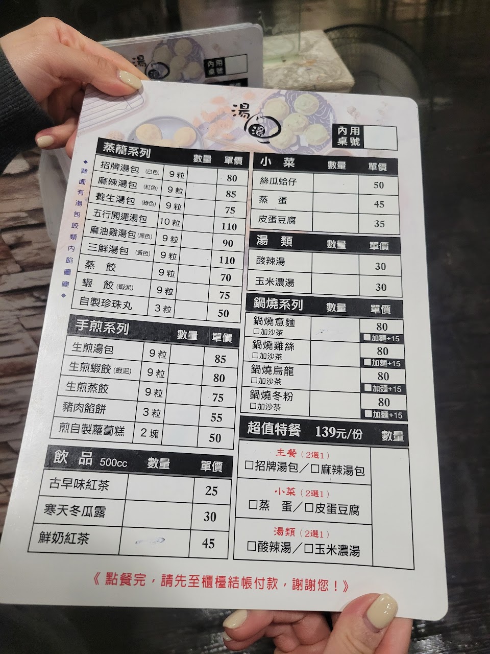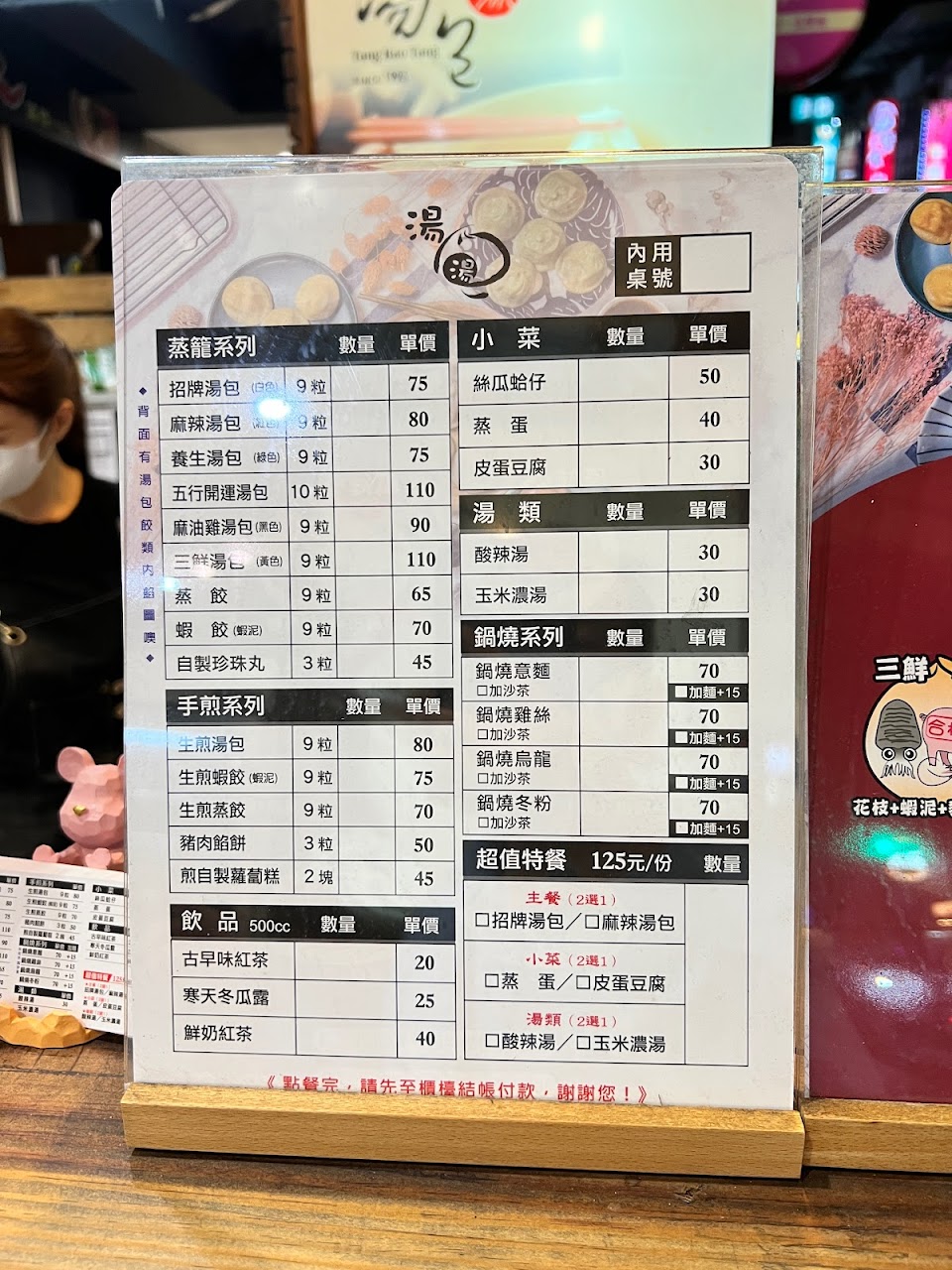 點了當下沒有看菜單點 湯包60+蒸蛋35+玉米濃湯25店員跟我收$120結果無聊看菜單…發現有優惠餐110當下跟店家說要用特惠價購買,被店員說這樣錢都算了不能退!?我都沒離開店家耶..店員的態度真的…嗯嗯嗯不敢恭維掰掰