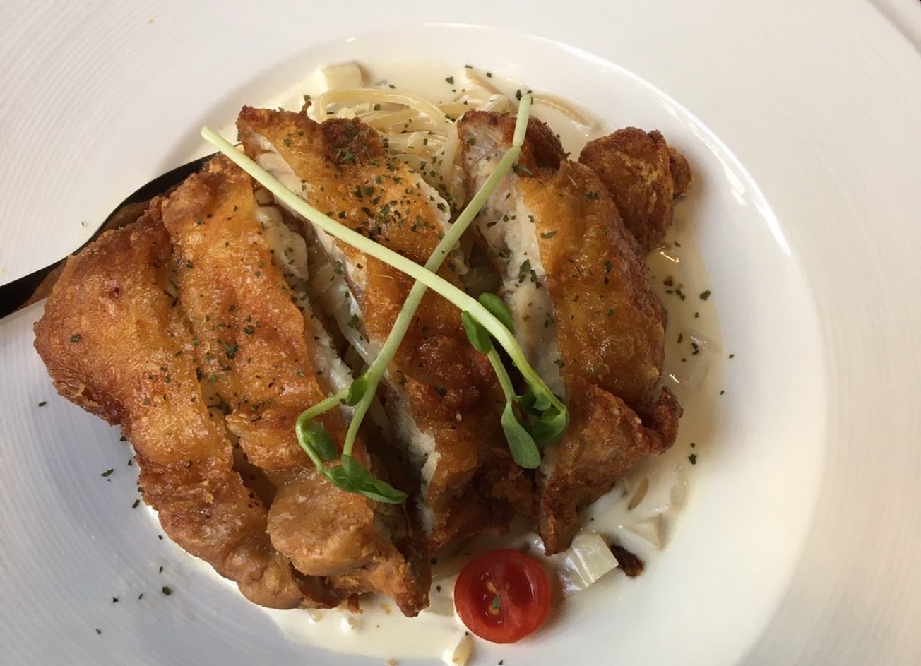 點了青醬雞腿排義大利麵,雞腿炸得剛剛好,外皮酥脆、肉很嫩很好吃,青醬味道也不錯~還會再來光顧
