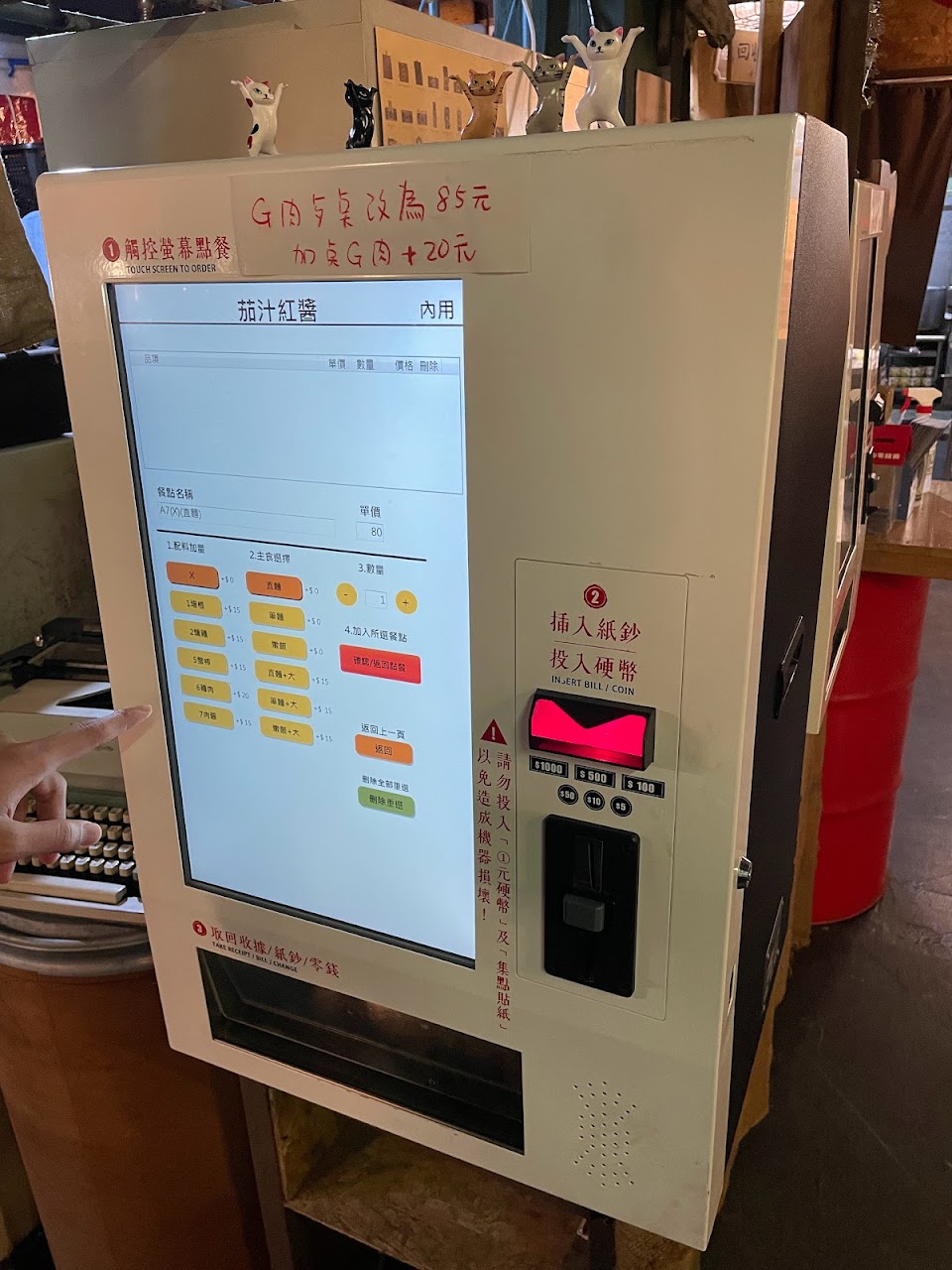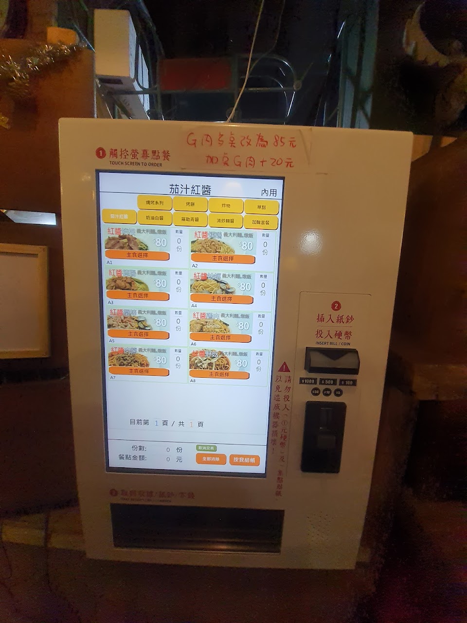 他們有兩台自動機器用於接單和付款。有烤義大利麵/烤米飯或燴飯/義大利麵(僅限義大利麵或通心粉)可供選擇,全部可選擇番茄醬、奶油醬、aglio olio 或香蒜醬(他們稱之為青醬)。然後是肉類的選擇(培根、雞肉和香腸)。因此,您選擇並提交訂單並付款(現金或投幣口)並獲得票號以領取您的訂單。非常有效率的系統和舒適的氛圍,儘管在這麼熱的情況下,我想如果我在裡面用餐的話會感覺有點不舒服。食物品質對於價格來說還不錯,份量有點小,尤其是肉的量。我點了雞肉烤通心粉,裡面只有大約 6 塊雞肉。但對於NT135來說,我認為這是非常公平的。