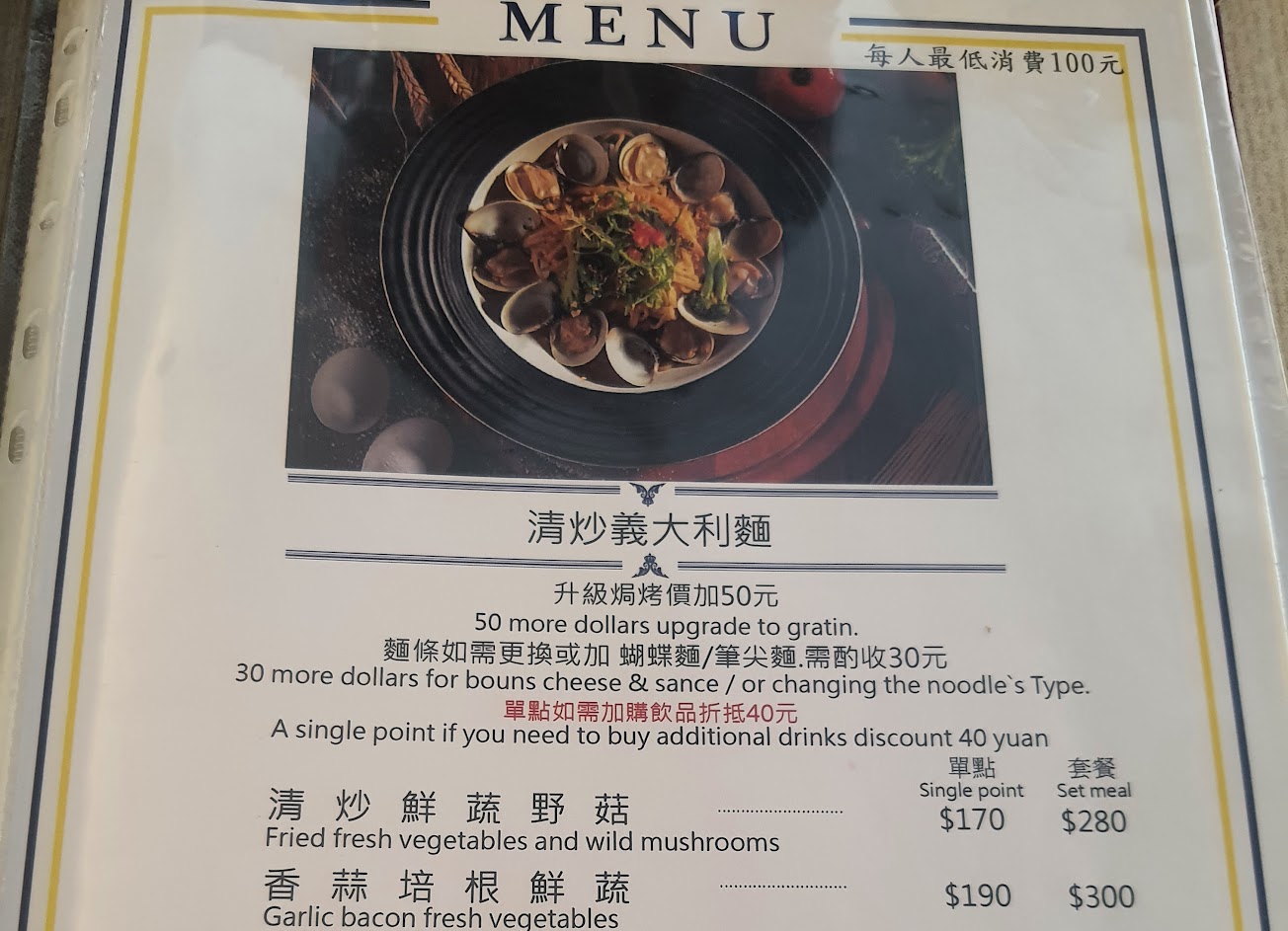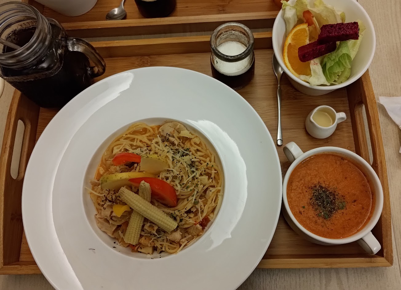 蠻家常的一間店,口味上比較偏台式義麵,價格實在,湯品很好喝,沙拉有水果陪襯,看得出用心??