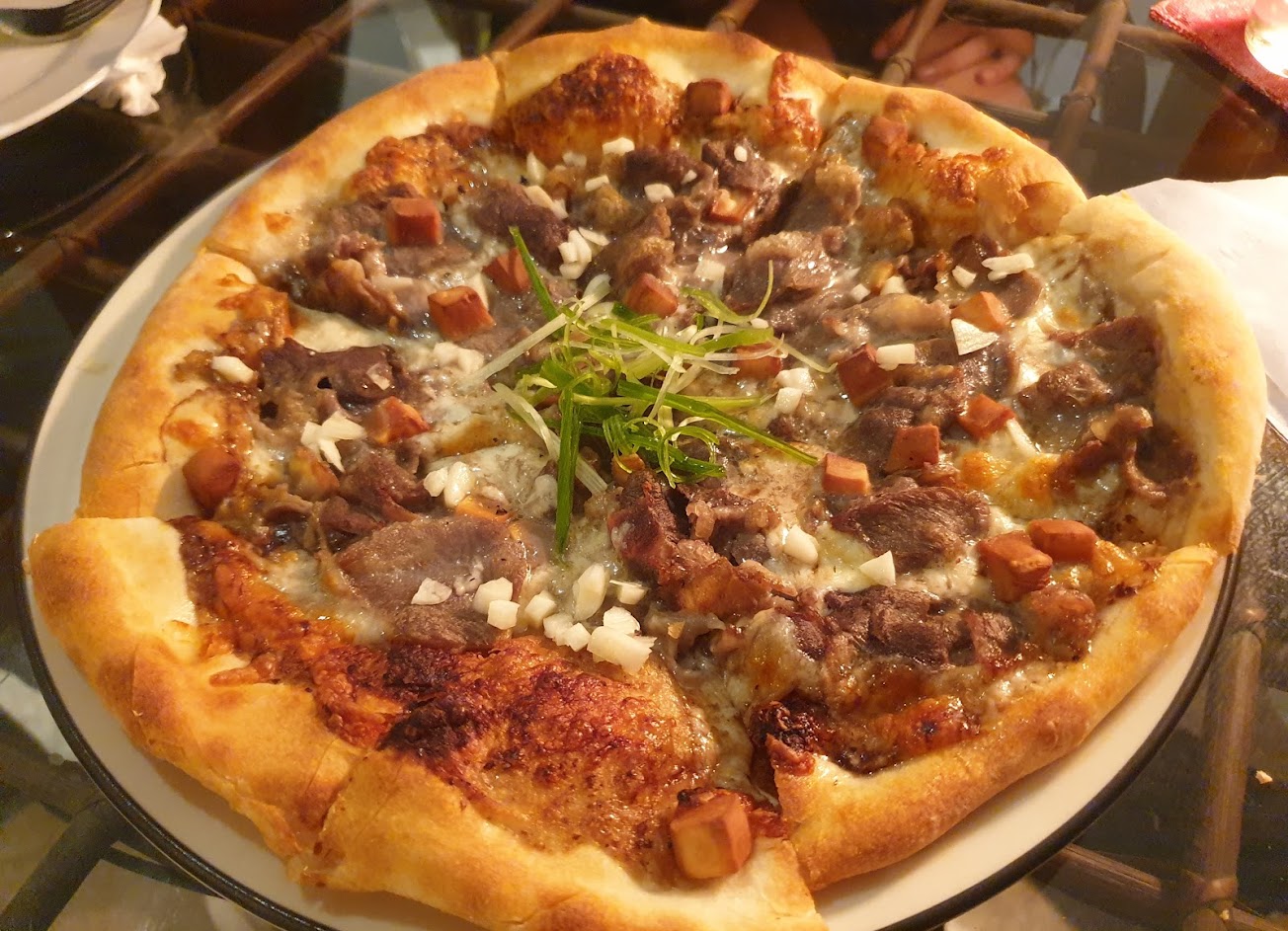 〔 披薩 〕餅皮微帶嚼勁,吃來有麵香不油膩,我們點了青醬牛肉菇菇跟起司四重奏。牛肉菇菇用料澎湃,牛肉跟菇舖滿滿,每片都吃得到肉跟菇;起司四重奏外加德式香腸,吃來鹹香夠味,但不至於像一般披薩的美式臘腸吃完覺得口渴要狂喝水。