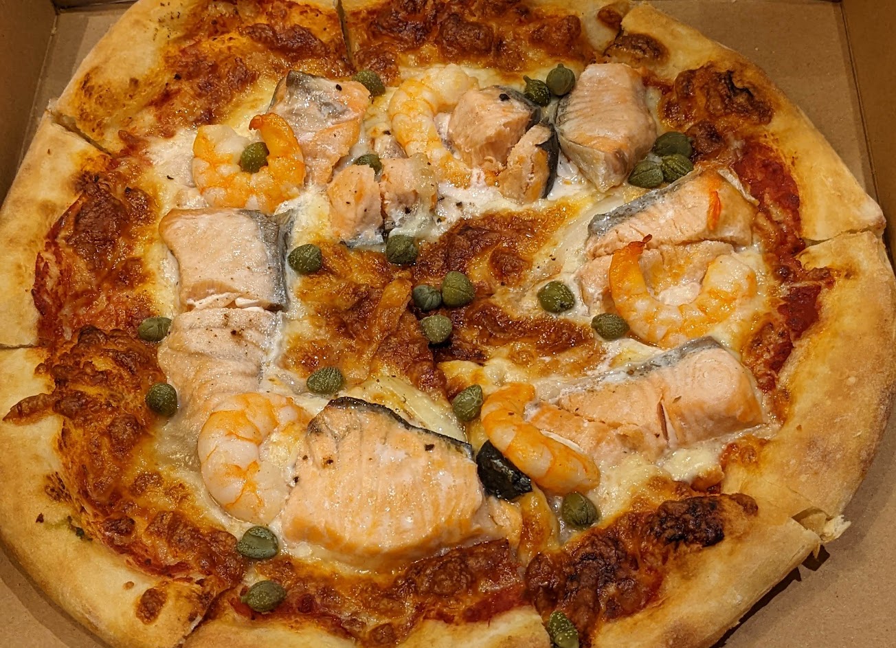 鮭魚蝦仁披薩入口非常驚艷,餅皮的麵粉香,加上鮭魚跟蝦仁是有厚度的,再配上酸豆,口味很均衡,非常推薦這個品項!