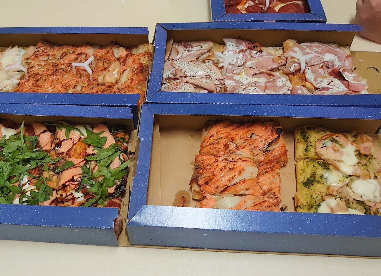 非常獨特的方型披薩!可以選擇大小,口味會更換,可以先預訂,屬於偏向外帶,內用空間不大,座位也很少,不過裝潢溫馨舒適;方形披薩沒有餅皮,整片都有料超爽~餅皮底下是脆的,但內裡蓬鬆酥軟,帶有嚼勁,口味的部分大推明太子洋芋,百吃不膩,燻鮭魚跟杏鮑菇火腿也非常美味,個人很愛這種煙燻味的火腿!整體而言很推薦!