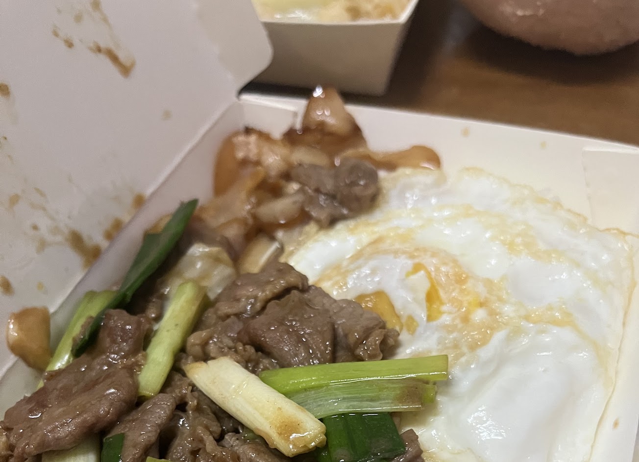 第一次吃打電話訂餐蔥爆牛肉飯CP值高,肉多還有蛋、豬耳朵配菜
