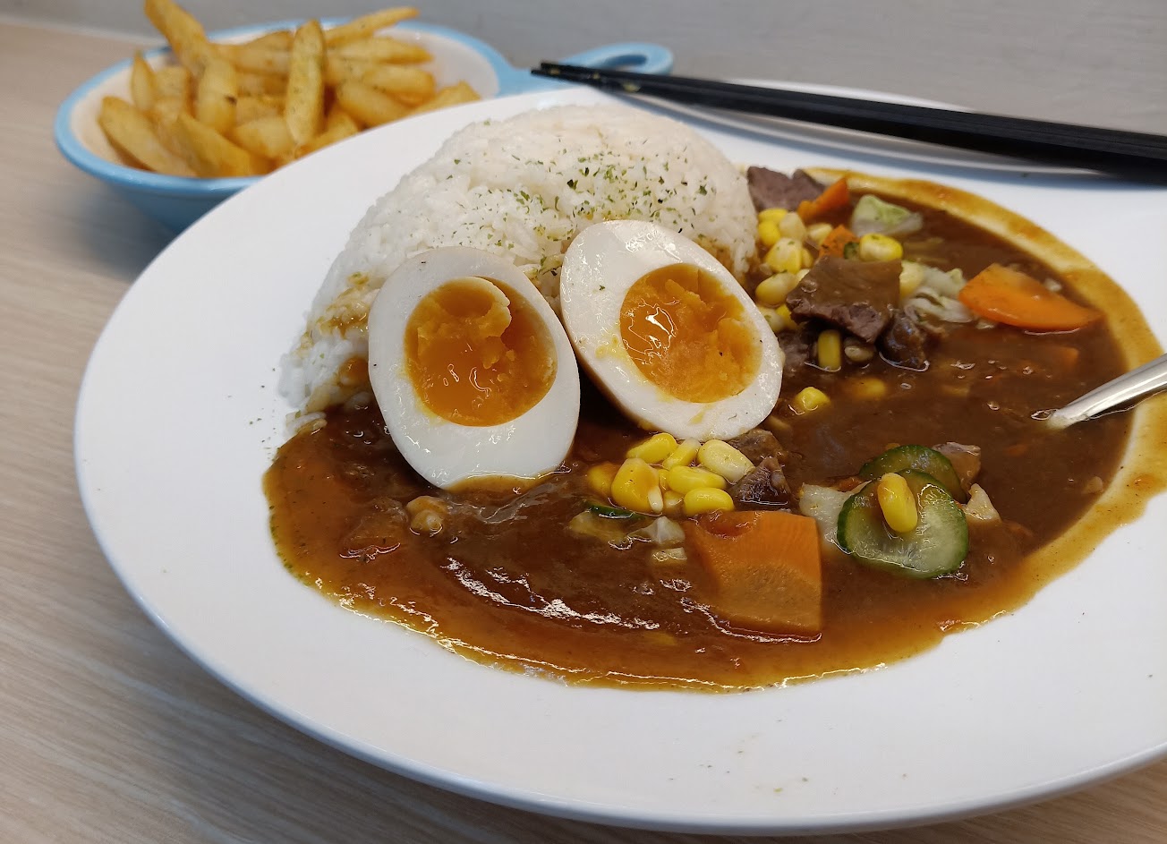 店內走簡單風,以這個價位量不算多但也足夠吃飽。咖哩香氣足但不夠濃稠,推薦搭小辣會更有風味。