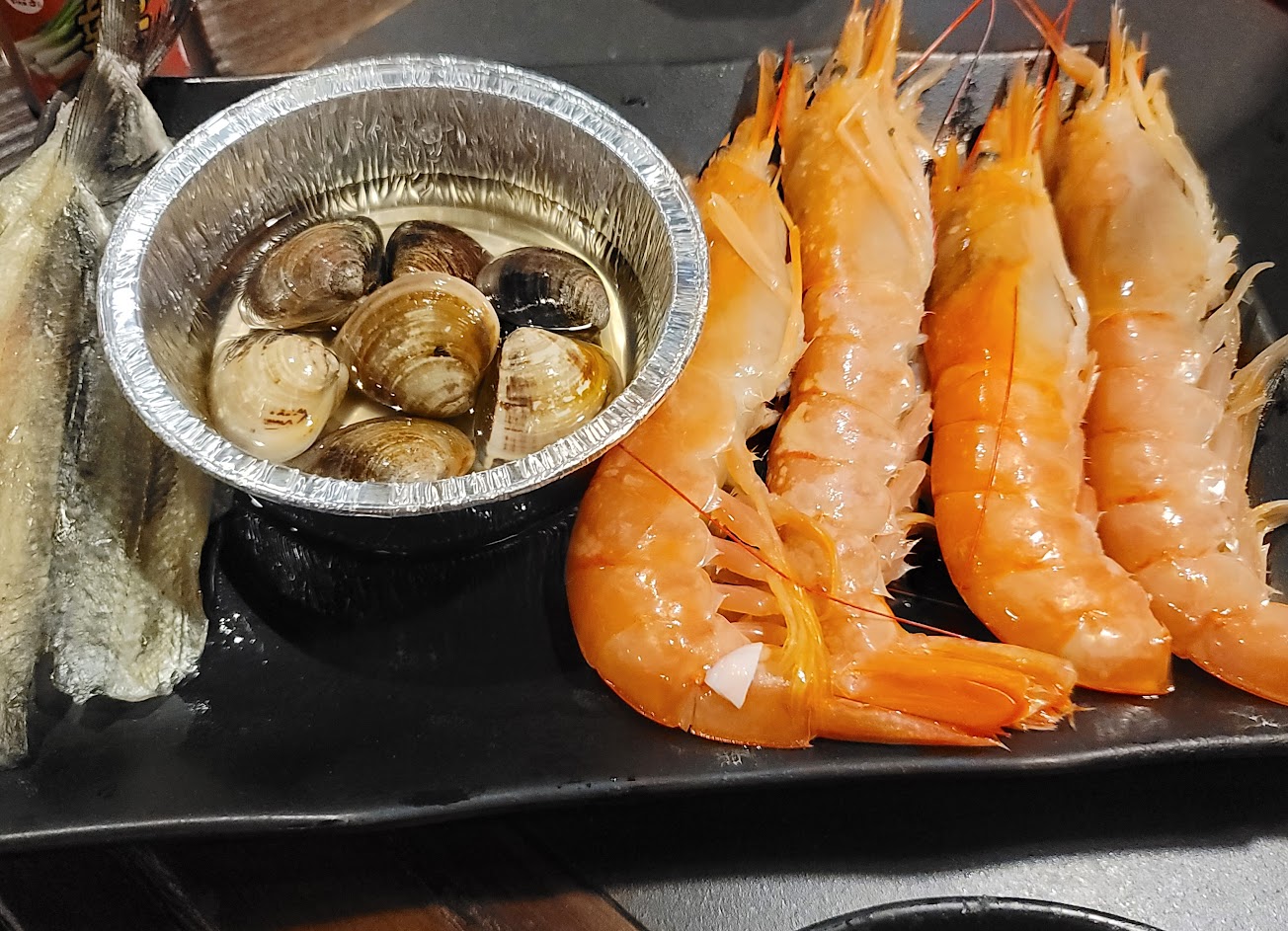 不過,有些小建議,希望店家能看得到… 1.雖說有先上肉盤,但,似乎需要先給我們「烤網」?我們才有辦法烤肉….. 2.今日的飯,似乎加的水量不夠,還有吃到米心沒有透的「米」?? 3.海鮮類, 如「生蠔」「天使紅蝦」「粉絲扇貝」 都被冷凍的好美好漂亮,卻也失去了海鮮的新鮮度… 殼都烤焦了,生蠔?上層還是「冰的」… 4.黑虎蝦,雖然沒有被冷凍,但,烤完頭滲透出綠色不知名液體覆蓋在肉上…..