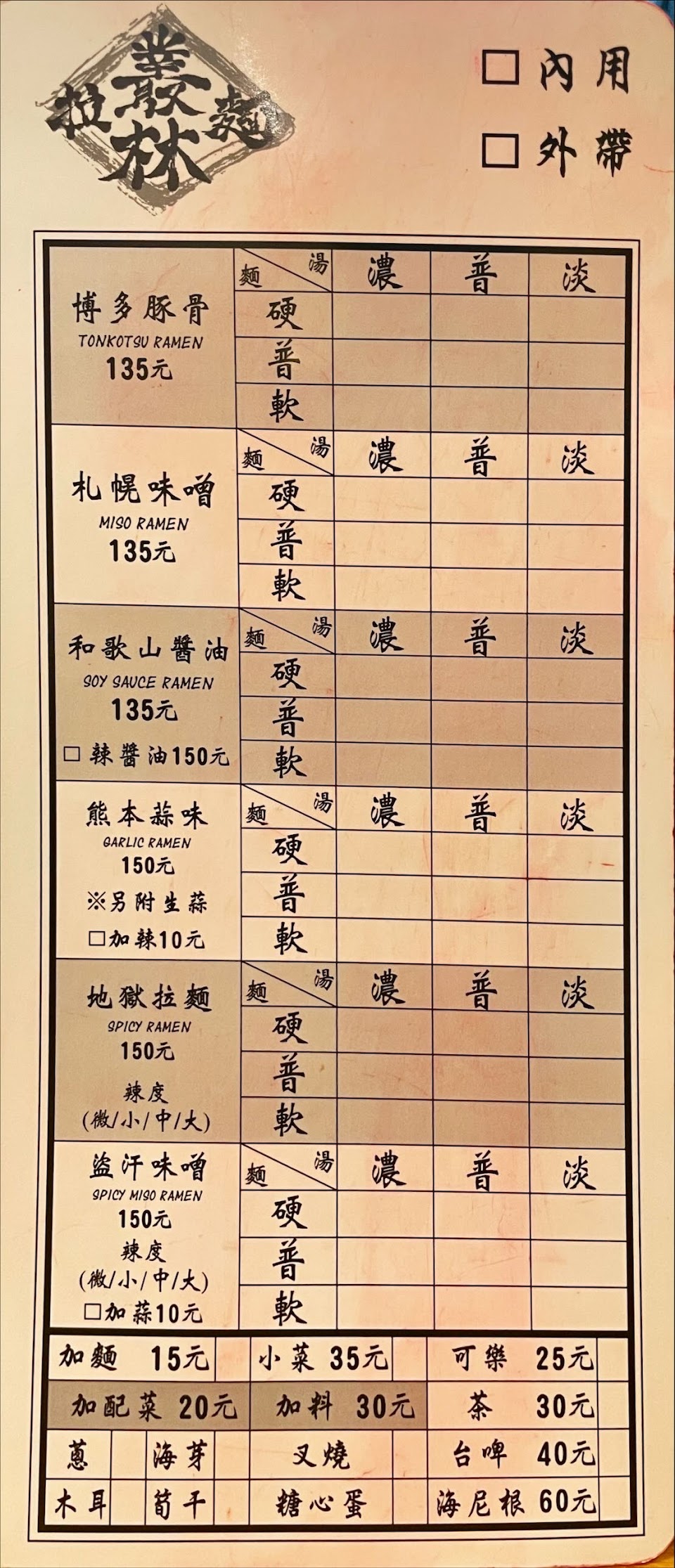 ✨菜單上面,除了湯頭可以選擇濃湯/普湯/淡湯,麵條也可以選硬麵/普麵/軟麵,算是非常平價的拉麵喔。