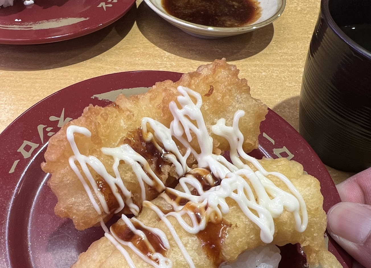 用餐時間軌道上的壽司倒的倒,掉得掉,點餐機送來的螃蟹奶油可樂餅顏色還炸的有點黑。