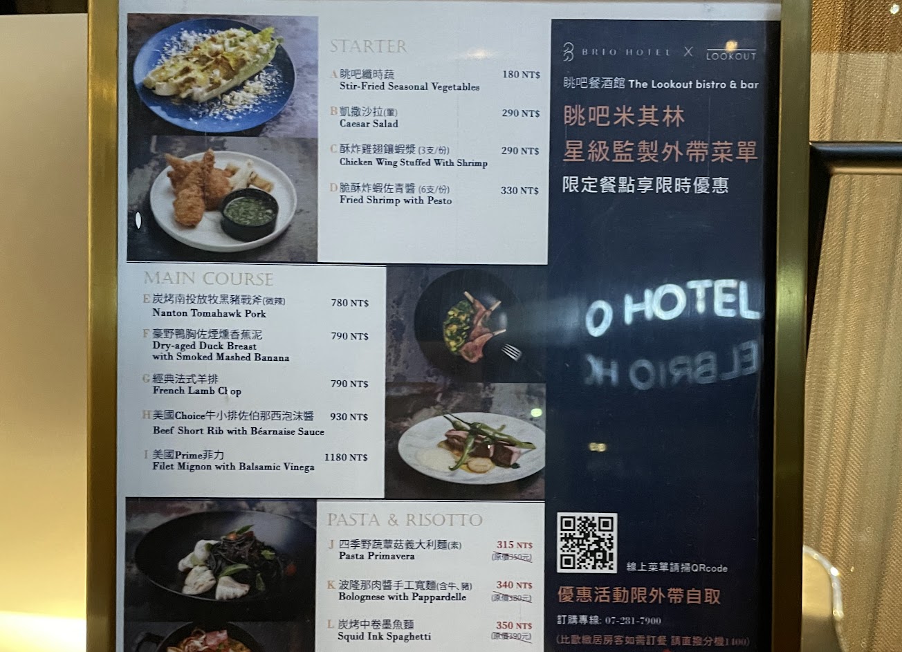 中高消費的餐酒館,以服務和景觀來說是很值得這個價位的,頗適合情人約會的好去處,餐點部分選擇不多但道道都算好吃,某些料理的配醬很特別,點餐前可看一下菜單(另外部分甜點含酒精,可以詢問一下服務人員);位於旅店的頂樓,樓下有蠻多的停車位,用餐前先預訂較好,如果偏好靠窗位置可以先提出,不過靠窗位置都只有雙人座;很酷的一點是不用服務鈴還是自己招手,移動特別的小方塊就好。