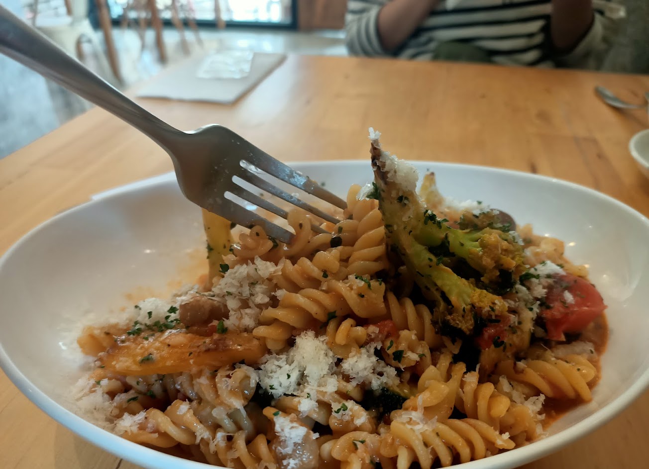 而且麵裡的配料也很優,多元豐富,像香料嫩雞裡就有堅果、玉米筍(忘記是不是還有莓果乾),整體不會太油、有起司香,雖然雞跟筊白筍的應該是同樣料理方式,但都很好吃。