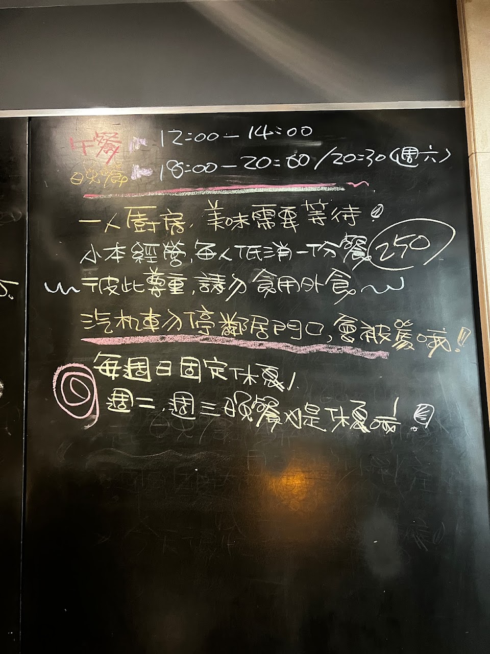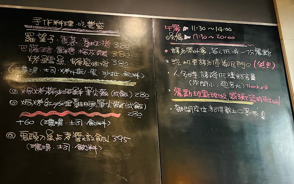 菜單寫在黑板是有創意。但是無法讓消費者看到菜色。我點芥末雞腿飯。雞腿太乾