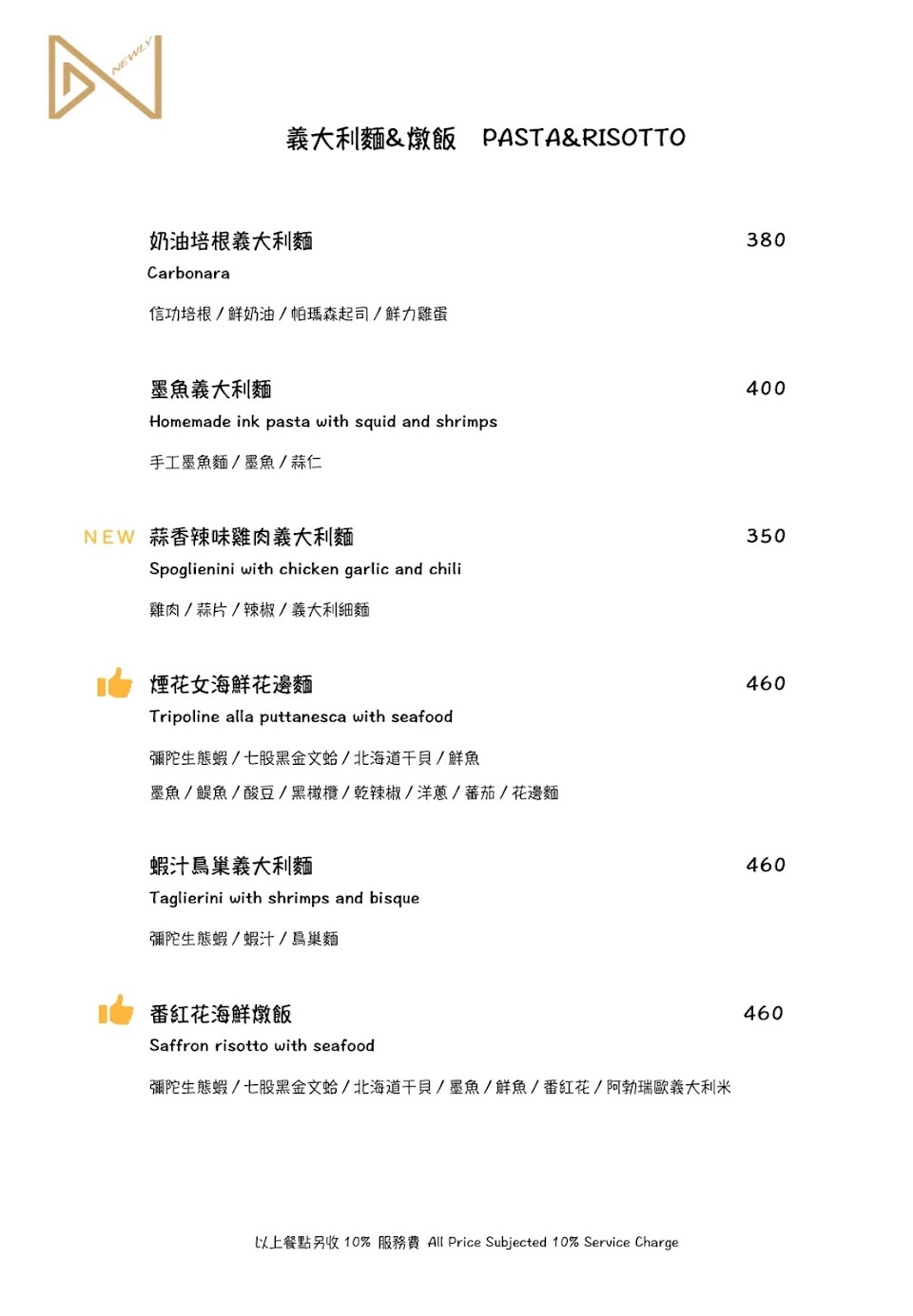 Chief 手藝了得,在傳統菜色中加了不少心意,義式之外也試了台式都相當不俗。陸續試了煙花女花邊麵(4.5星)松阪豬拌麵(5星)都是令人回味的菜色。番紅花燉飯跟牛頰只能下次了。(詳細請看照片說明)