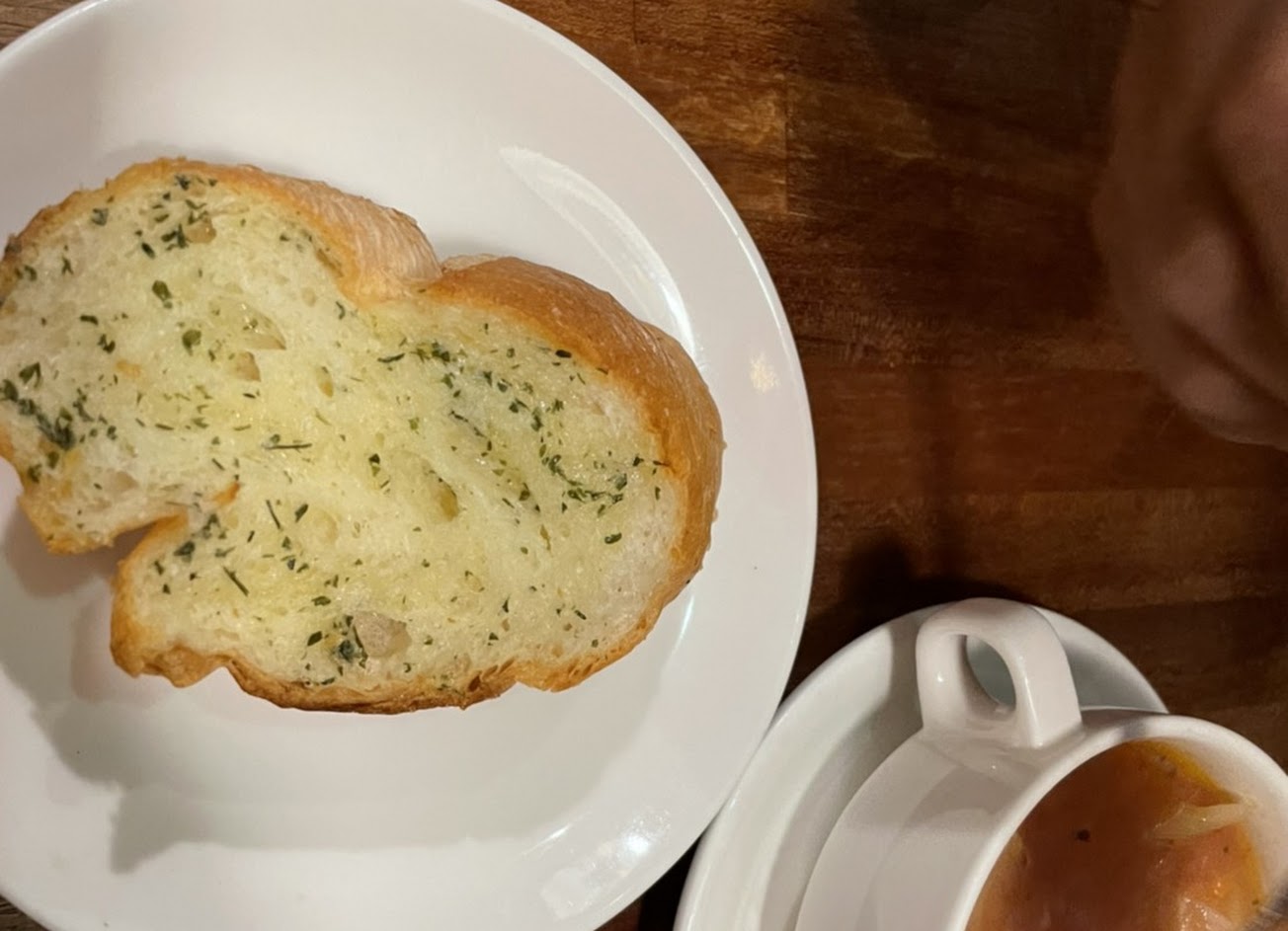 大蒜麵包酥脆又很香,配湯更讚