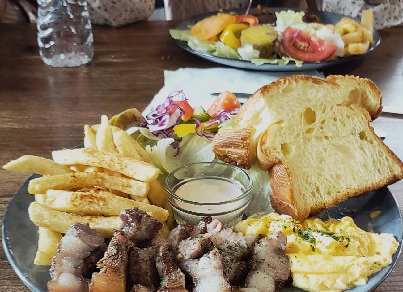 點了無骨雞腿排、沙爹雞柳等主食,食物是中規中矩的表現。搭配可選丹麥吐司、鮮奶吐司、白飯,三種據老饕說法,是都好吃? 沙拉?給的很澎湃,有小黃瓜、地瓜、番茄等等,加上店家特製優格醬,好吃。