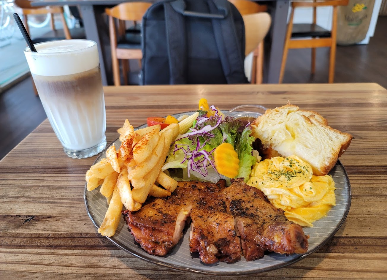 點了相同沒改變過的「嫩煎無骨雞腿排」加上美式炒蛋、美式脆薯、時蔬和風沙拉與丹麥吐司,另外加點了一杯拿咖啡,總計334元,但為了來看喵喵,之前已經吃了兩塊麵包一杯熱可可,可能今天午餐晚餐看以省下來了。