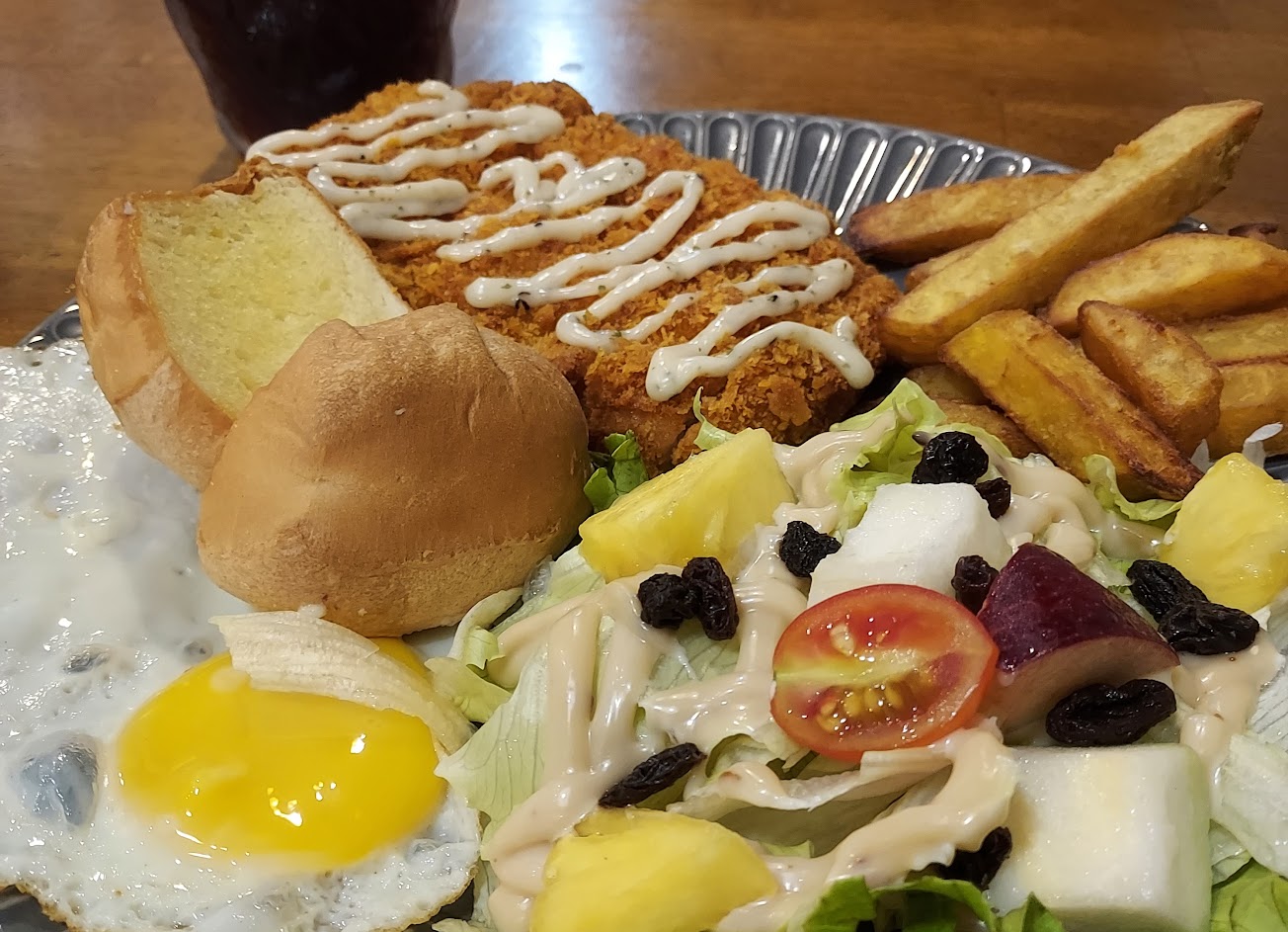 點了厚切蒜香檸檬豬排套餐$185 濃湯普通,紅茶超級好喝,不澀不死甜,我願意每天買來喝的那種。 沙拉蠻好吃的,不過建議能將醬料另外放,讓個人自行沾取。 豬排厚度還好,吃不出蒜香或是檸檬味,但是炸的很酥很香,內部不乾柴還蠻好吃,不過配那個醬很膩口。 地瓜薯條,一樣炸的很好吃,很喜歡。 麵包很乾很紮實,本來想像柔軟的奶油餐包或是酥酥的蒜香麵包,小失望……