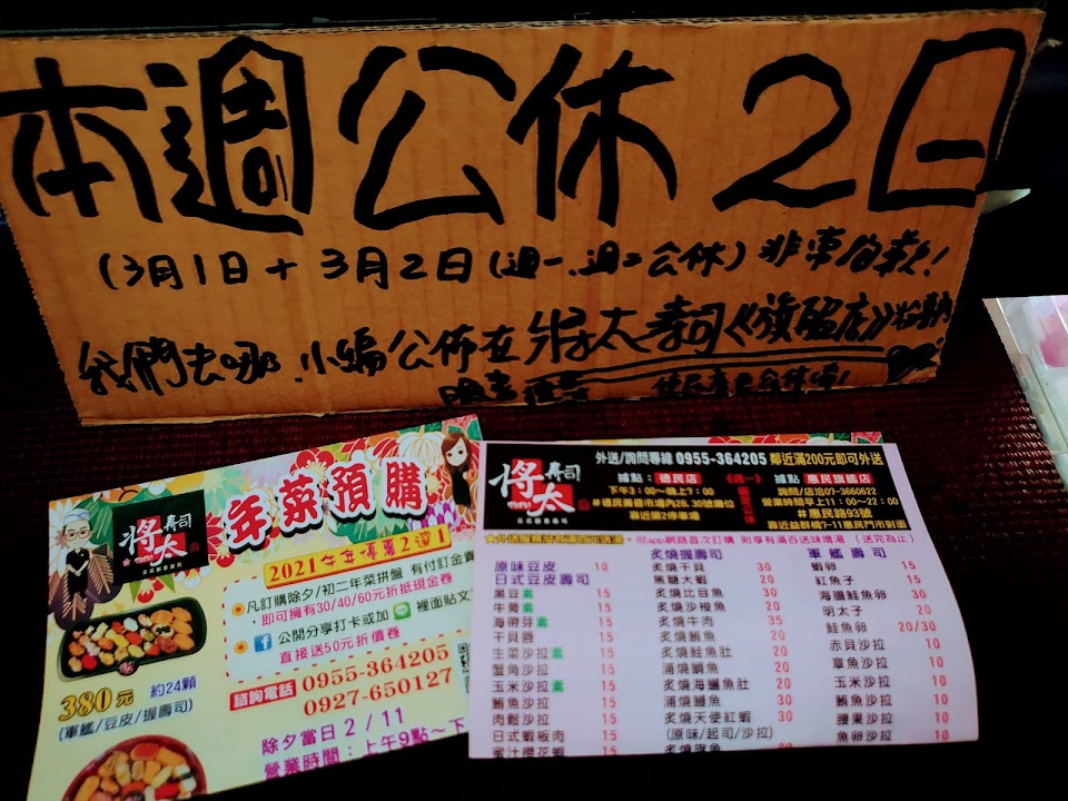 位於楠梓區惠民路89號的將太壽司,價格平價,用餐環境乾淨,座位不多,主要已外帶為主,壽司選項豐富,有提供行動支付,消費滿百元贈味噌湯…