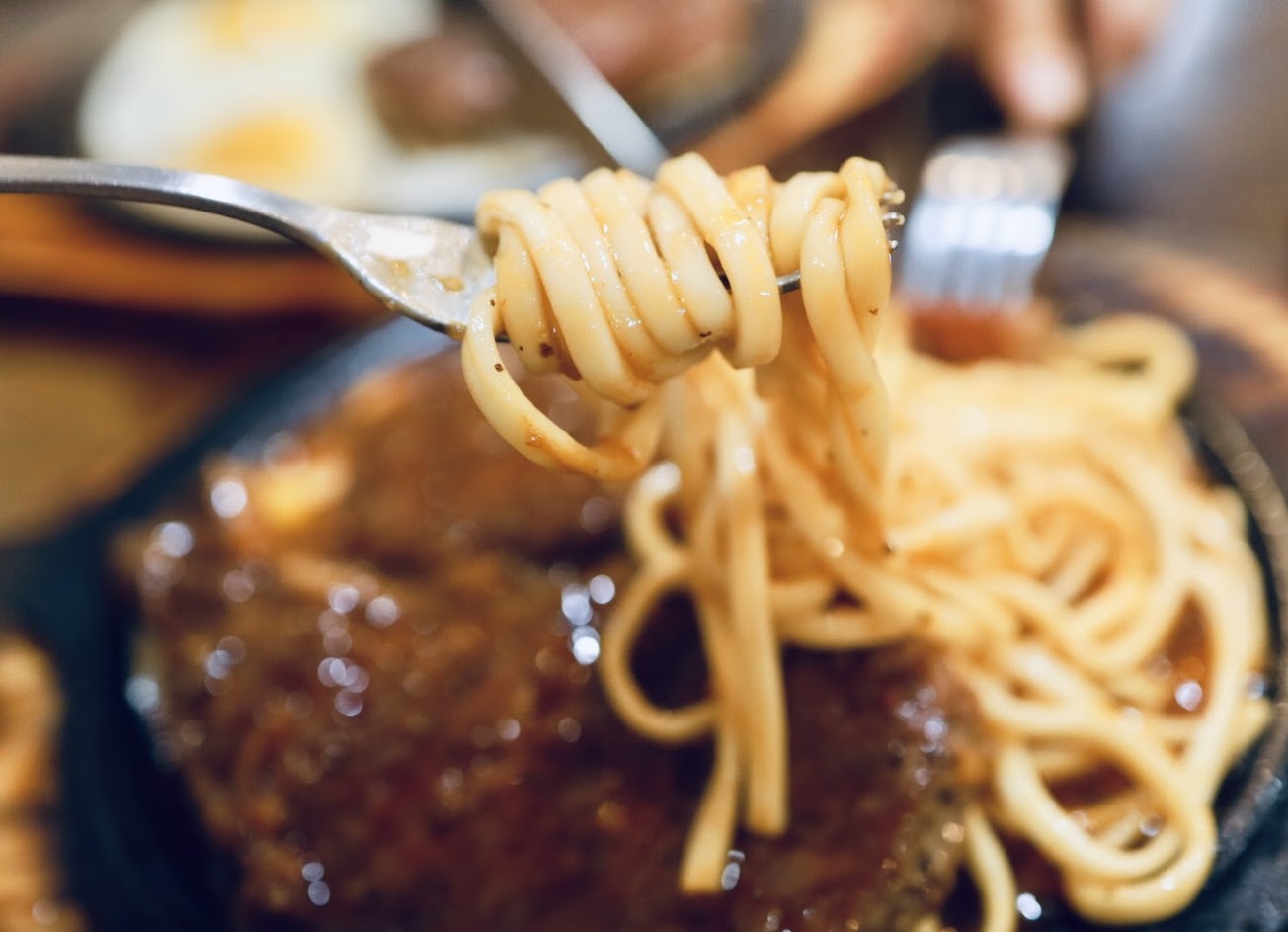 排餐的肉質偏韌,我的混合醬吃起來甜甜的,麵很好吃,搭配超燙的鐵板,超香