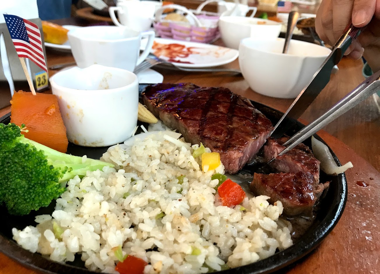 份量多、出餐速度快 上餐的時候,服務生會借湯匙把鐵盤上的飯壓扁 吃到一半會有領班之類的人出來關心你的肉有沒有熟,有沒有什麼需要加強的地方 薯條現炸可以續,主餐的飯和蔬菜也可以續一次 沙拉吧品項有點少,但濃湯有兩種 洗手間很貼心的附了牙刷、漱口水、牙線棒
