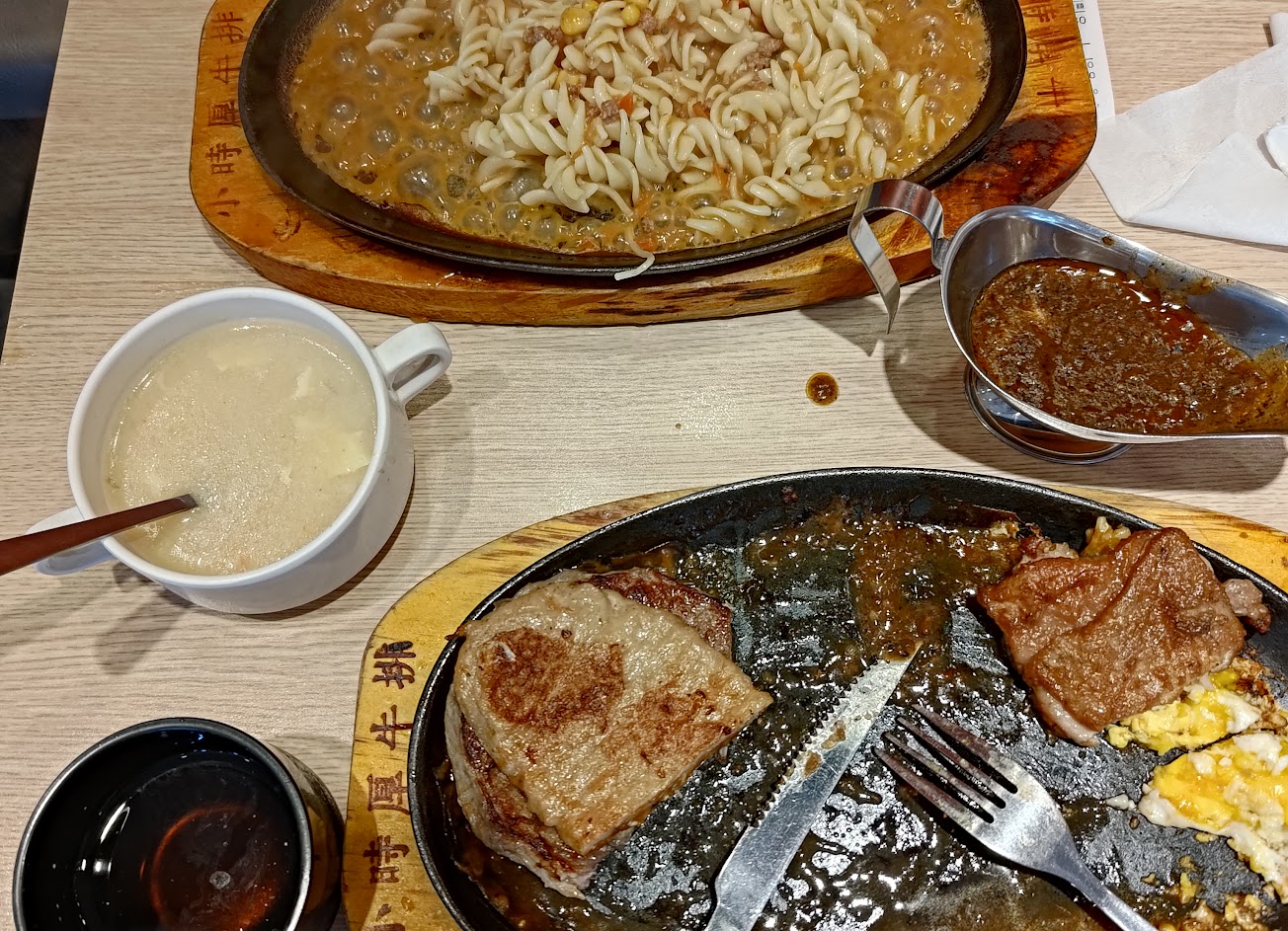 肉排好吃,推小總匯,牛排醬也不錯,黑胡椒醬更香好吃些,麵有細麵和螺旋麵,推螺旋麵。店內有自助吧有吐司、三種零食、飲料甜點、濃湯、黑胡椒醬和餐具讓客人自行取用。
