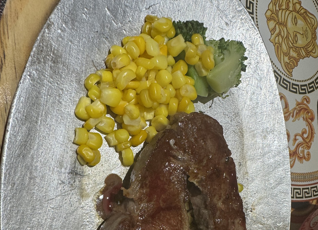 荷蘭松阪豬, 玉米濃湯, 美國嫩煎牛排, 黑胡椒醬跟洋蔥醬