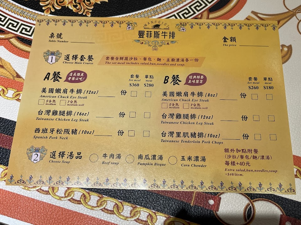 隱身於市街的平價牛排館,卻一點都不平凡,著實令人大吃一驚!!! 餐廳雖不大,擺設雖簡單但不失高雅,尤其店內環境乾淨優雅,連餐桌上的用餐污漬都擦拭的很乾淨,餐具連一般常見的水漬都瞧不見,且餐巾紙都經店家細心挑選厚實柔軟的紙,拭嘴時感受輕柔,可見店家的用心。就連館內的服務人員似乎都經過老闆的訓練,用過的餐盤都立即收走,不致於杯盤狼藉影響食慾,服務很好卻沒加服務費,雖屬平價牛排館,卻媲美星級牛排館!讚??? 第一道前菜-沙拉、簡單的生菜小黃瓜搭配美味的和風醬,簡單卻不失其味。 第二道南瓜濃湯(或牛肉湯/玉米濃湯)+餐包經過細心熬煮,湯濃味美,讓一向排斥南瓜味的女兒讚不絕口。餐包雖無內餡、但是加熱到鬆軟適中,一口咬入在口中釋放出淡淡的麵包香味,搭配濃郁甘甜的南瓜濃湯,讓人意猶未盡。 第三道乾麵-麵條似乎經過店家主廚所細心挑選,一般市面不常見的麵條,Q軟適中咀嚼後淡淡的麵條+醬汁味道在口中散開,令人一口接一口,雖僅經過簡單調味,但麵條與醬汁搭配的美妙絕倫。 第四道主菜-我跟2位女兒分別點了260元(8oz)/360元(12oz)嫩肩牛排套餐,牛肉細緻完全沒吃到牛筋,這可瞧見主廚的用心。搭配牛肉下方的蒜末,輕沾一些鹽末即可引出牛肉的鮮味。店家的胡椒牛排醬是經過熬煮,胡椒味濃郁辣味適中,我想主廚店家應係師出正統牛排館。 用餐中店家招待一盤魯?筋肉,入口牛油香味在口中化開,讓人一口接一口,雖是招待的小菜卻一點也不馬虎。??? 用餐感想:相比一般夜市牛排1-200元的價格,只能說曼菲斯牛排性價比超級高,連超級挑剔的2個女兒都讚不絕口,相比鄰近的牛排館,個人覺得曼菲斯的4.5顆星是低估了。 服務 內用 餐點類型 晚餐 平均每人消費金額 $200-400 餐點:5 服務:5 氣氛:5 建議的餐點 嫩肩牛排的a餐b餐 停車位 停車不方便 停車場 道路停車位不多,雖無紅線禁停,需跟鄰近住家借停一下。