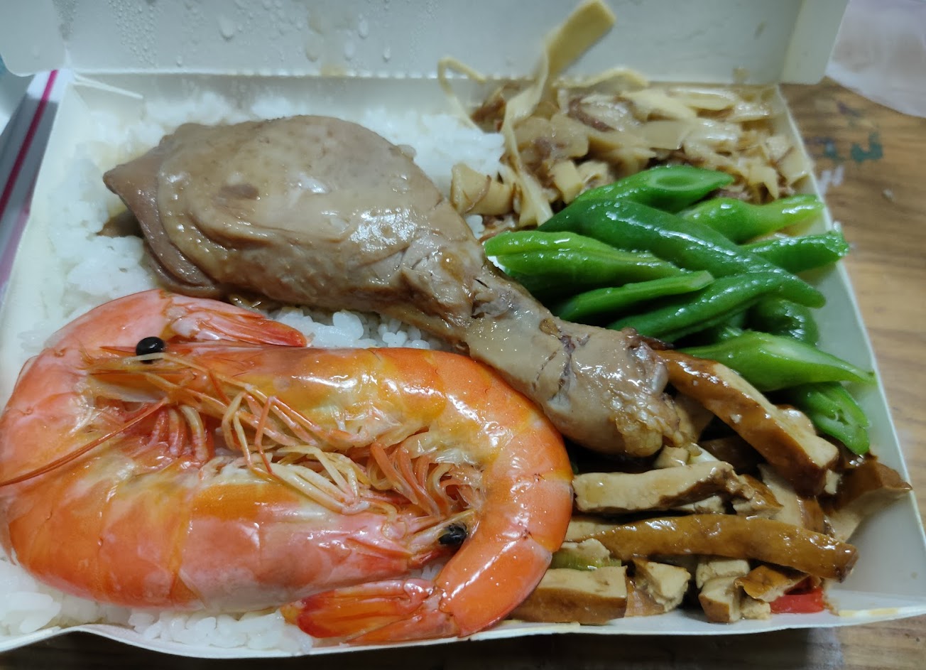 我跟朋友同時買他內用我外帶,他多到放進外帶盒子會爆的量而且3菜一肉才60我的把那小空間放滿兩菜一肉就65了