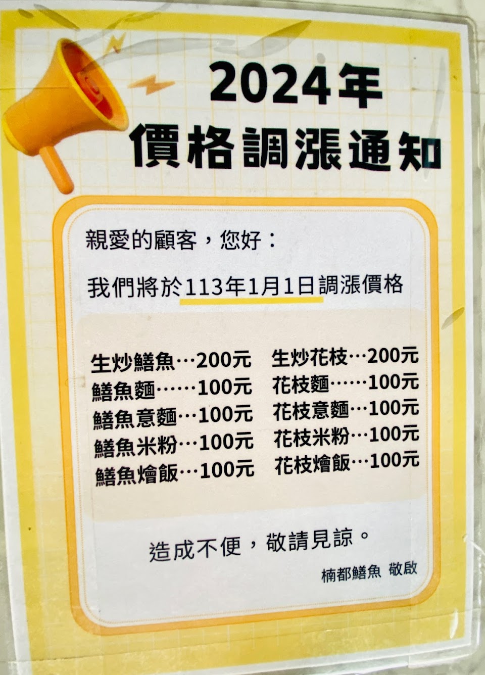 ?價格:除主菜單炒外,其他項目價格一樣。今天2人,1人點鱔魚意麵$80元、1人點鱔魚麵$80元(113/1/1原價$80元,統一調整為$100元)