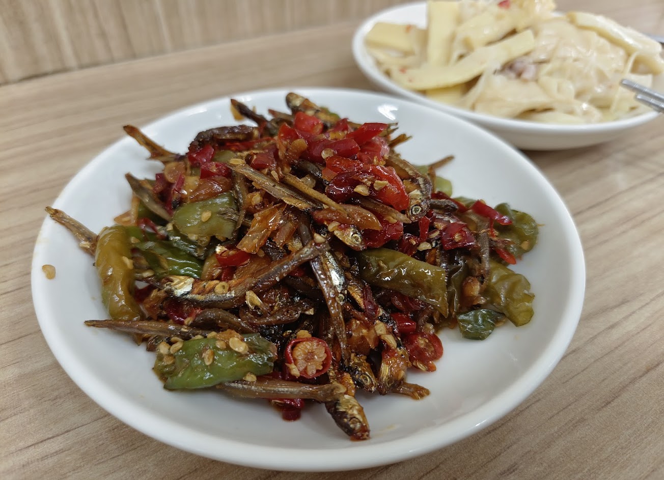 用了大量的辣椒和小魚乾炒製而成,小魚乾咬來鮮香,辣椒辣香撲鼻,辣味在一入口時溫溫地瀰漫,而後竄入喉頭,非常有後勁,嗜辣者必點。