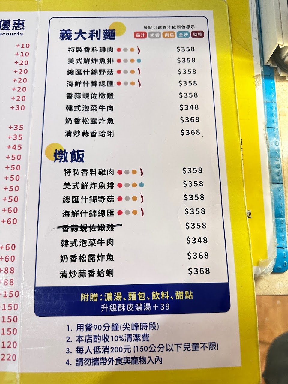 個人重口味 也不喜歡乾乾的義大利麵,所以點餐時要求麵的醬汁要多一點點,服務生回答 沒辦法 我們都是固定的,好⋯不能多醬就算了,那我習慣吃完餐點後再喝湯,希望濃湯能最後再上 避免冷掉,服務生依然回答 不好意思 我們都是固定的⋯